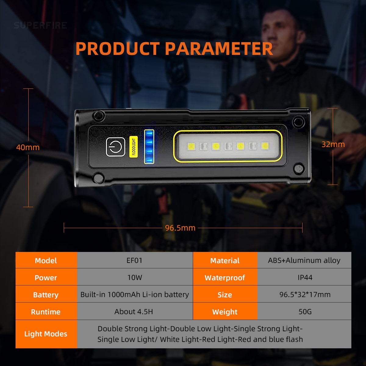 Mode: Double strong light-double low light-single strong light-single low light/White light-red light-red and blue flash-off
