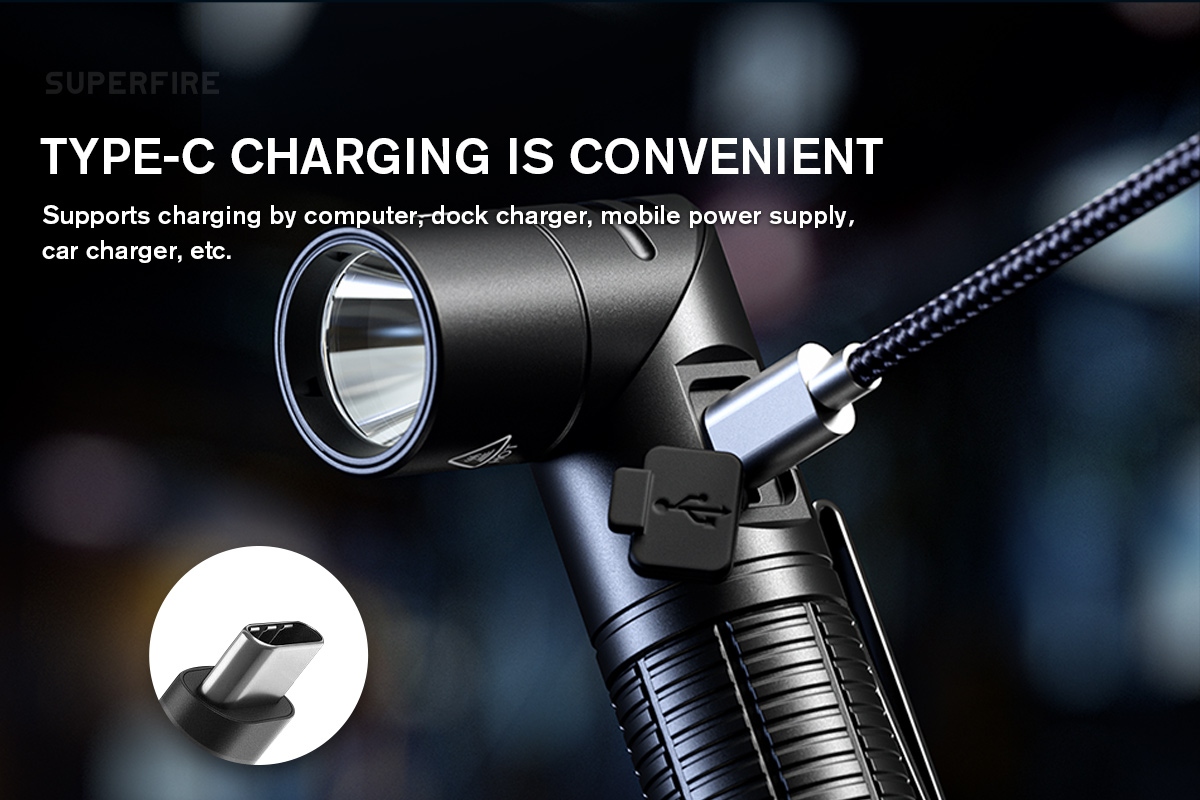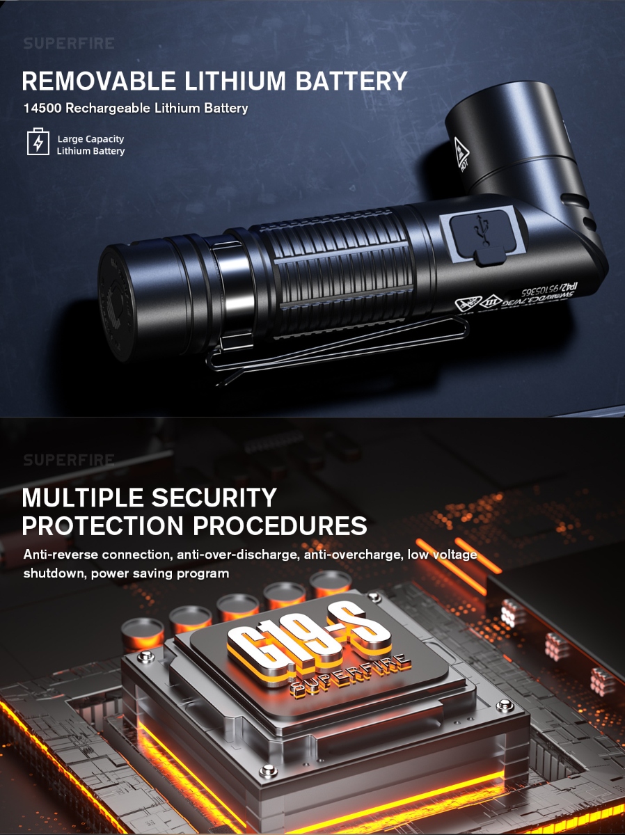 The flashlight boasts a magnetic tail, enabling hands-free operation by securely attaching to metal surfaces—a convenient feature for mechanics, technicians, and outdoor enthusiasts. With the ability to function as both a handheld flashlight and a headlamp, the G19-S offers unparalleled versatility. Its 90° adjustable angle ensures optimal illumination regardless of the task at hand. Designed for seamless mode switching, users can effortlessly toggle between five modes—Strong light, Medium light, Low light, Strobe, and SOS—suitable for various environments and emergencies. The lamp head rotates clockwise, expanding its utility for multiple purposes, from focused illumination to broader coverage. Equipped with a quick-release bracket, the G19-S ensures swift deployment and hassle-free operation, enhancing user convenience in demanding situations. Featuring high elastic webbing, the flashlight doubles as a headlamp, offering a comfortable and breathable fit for extended wear. Its two-way belt clip facilitates easy attachment to belts or straps, ensuring stability during movement. Independently developed LED chips power the G19-S, delivering high brightness and energy efficiency to meet diverse lighting requirements. The flashlight supports Type-C charging, enabling effortless replenishment via various sources, including computers, dock chargers, mobile power supplies, and car chargers. With distinct red and blue indicator lights, users can easily monitor the charging status—red light indicates ongoing charging, while blue light signifies a fully charged battery. The G19-S incorporates multiple security protection procedures, including anti-reverse connection, anti-over-discharge, anti-overcharge, low voltage shutdown, and power-saving programs, ensuring longevity and user safety. Crafted from aluminum alloy, the flashlight embodies durability, resilience against falls, and wear resistance, making it a reliable tool for rigorous environments.
