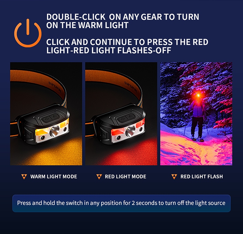 Weighing in at a mere 48g, the HL05-M is a featherweight champion, ensuring your outdoor excursions remain unencumbered by heavy gear. Its compact and portable design makes it the perfect companion for any adventure. One of the standout features of the HL05-M is its intelligent sensing mode. With a simple wave of your hand, you can effortlessly toggle the light on or off, adding a touch of convenience to your outdoor experiences. Equipped with three light sources—white, yellow, and red—the HL05-M offers versatile illumination options to suit any situation. Whether you need clarity, warmth, or night vision preservation, this headlamp has you covered. Featuring a dual-mode design, the HL05-M seamlessly transitions between conventional lighting and smart sensor functionality. With two switches for easy mode selection, you have complete control over your lighting experience. Charging your headlamp is a breeze thanks to the Type-C charging port. Offering fast and convenient charging compatibility with most universal charging cables, you can rest assured knowing your HL05-M will always be ready to light up the night. Powered by a built-in 14500 rechargeable battery, the HL05-M boasts an impressive 5-hour runtime, ensuring you have reliable illumination throughout your adventures. The charging indicator light keeps you informed, with red indicating charging and blue signaling when fully charged. With adjustable tightness, the HL05-M can be tailored to fit any head type, ensuring maximum comfort during extended wear. Whether you're exploring rugged terrain or embarking on a nighttime hike, this headlamp is your trusty companion.