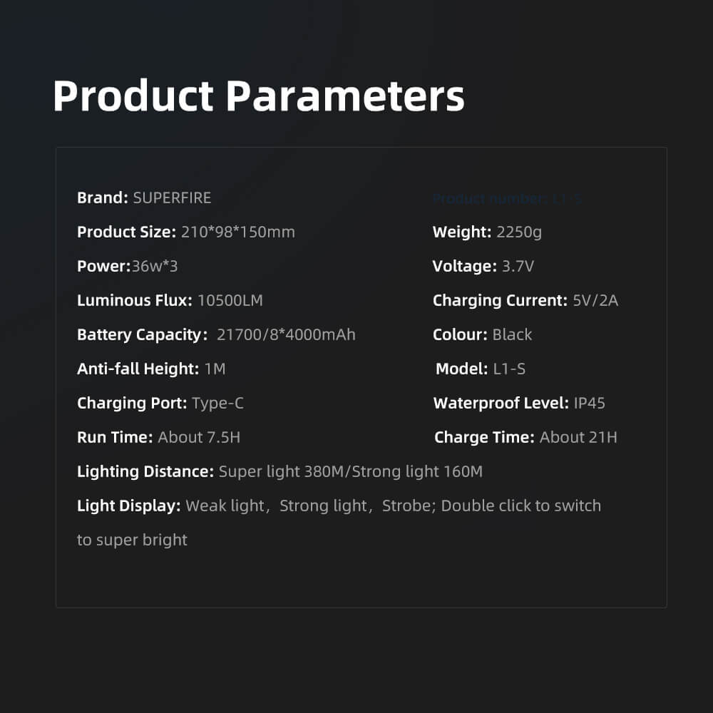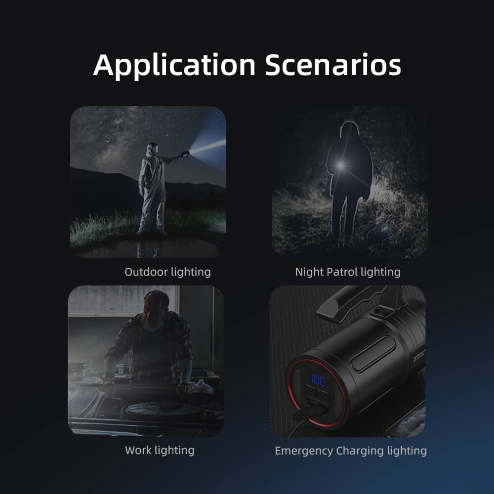 The L1-S searchlight offers an impressive 7.5 hours of continuous use at strong light mode, ensuring you have reliable illumination throughout your activities.Equipped with advanced heat dissipation technology, the L1-S can handle the intense brightness without overheating. This ensures not only peak performance but also extended product life.The L1-S searchlight packs a powerful punch with its high-capacity rechargeable battery, offering extended endurance. The digital battery display keeps you informed about the remaining power, so you're never caught off guard. You'll always know when it's time for a recharge.The ergonomic handle design ensures a comfortable grip, making it easy to carry and maneuver the L1-S, even during extended use.