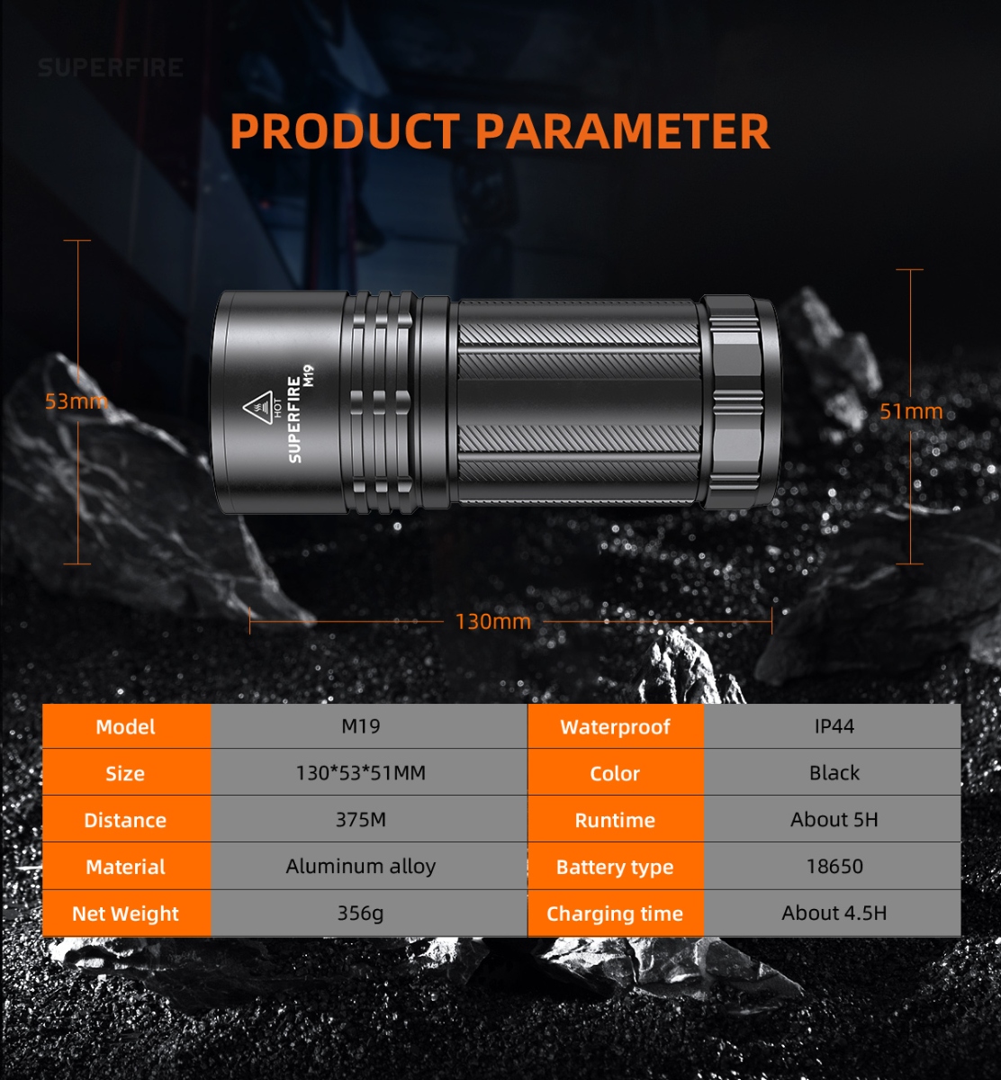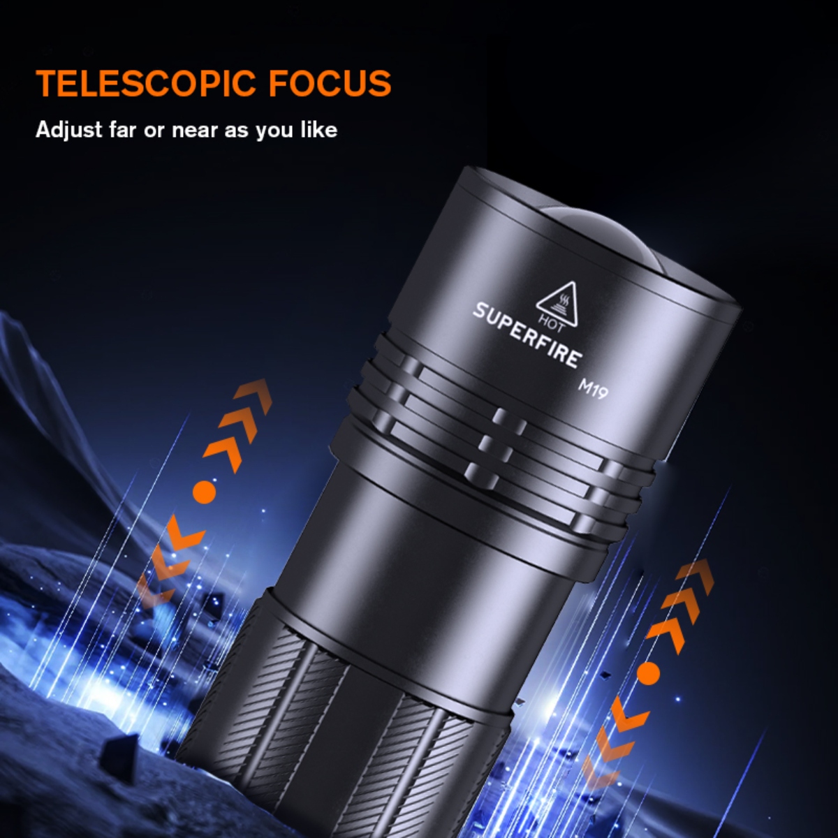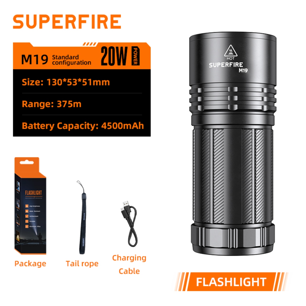 With a high power of 20W and an astounding brightness of 1750 lumens, the M19 Flashlight casts a brilliant light capable of piercing through darkness, illuminating paths up to 375 meters away. Equipped with a telescopic focus mechanism, users can adjust the beam to suit their needs, toggling effortlessly between floodlight and spotlight modes. This versatility ensures clear visibility both near and far. The M19 integrates cutting-edge lamp bead technology, boasting higher brightness, longer range, and a rounder light spot. Its superior illumination quality ensures optimal clarity and coverage. The M19 Flashlight offers five distinct lighting modes: Low light, Medium light, Strong light, Strobe, and SOS, catering to various scenarios and emergencies. Users can seamlessly switch between modes with a single press, adapting to any situation with ease. Powered by a robust 4500mAh 18650 rechargeable lithium battery, the M19 ensures extended runtime of up to 5 hours, making it a dependable companion during outdoor adventures, emergency situations, or professional use. Featuring a Type-C charging port, the M19 facilitates quick and convenient recharging, with a charging time of approximately 4.5 hours. The battery indicator provides clear feedback on the charging status, ensuring optimal usage and maintenance. Crafted from durable aluminum alloy and boasting an IP44 waterproof rating, the M19 Flashlight withstands the rigors of outdoor exploration and adverse weather conditions, guaranteeing reliable performance in any environment.