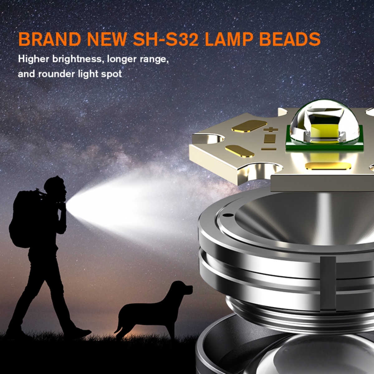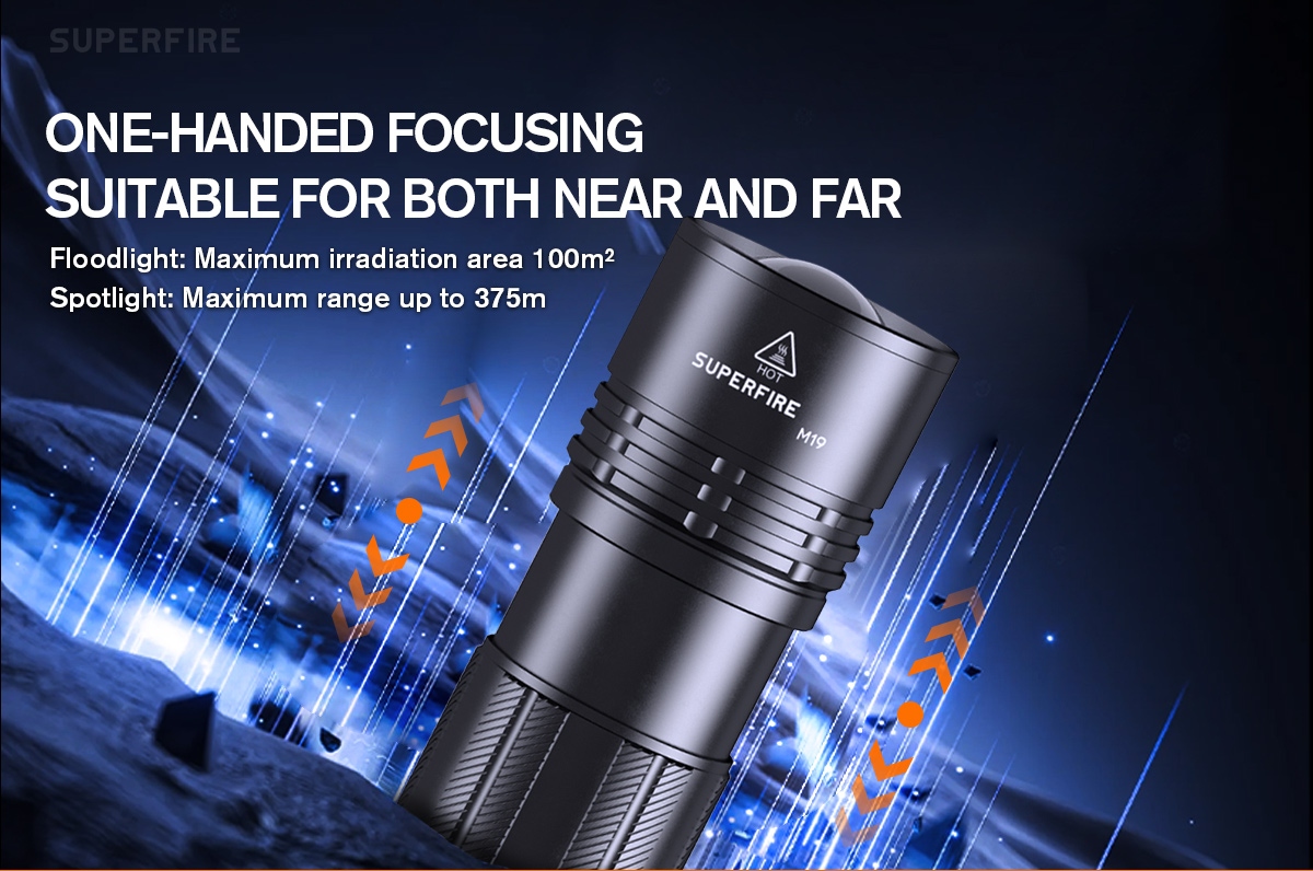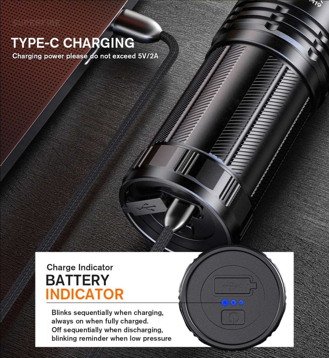 With a high power of 20W and an astounding brightness of 1750 lumens, the M19 Flashlight casts a brilliant light capable of piercing through darkness, illuminating paths up to 375 meters away. Equipped with a telescopic focus mechanism, users can adjust the beam to suit their needs, toggling effortlessly between floodlight and spotlight modes. This versatility ensures clear visibility both near and far. The M19 integrates cutting-edge lamp bead technology, boasting higher brightness, longer range, and a rounder light spot. Its superior illumination quality ensures optimal clarity and coverage. The M19 Flashlight offers five distinct lighting modes: Low light, Medium light, Strong light, Strobe, and SOS, catering to various scenarios and emergencies. Users can seamlessly switch between modes with a single press, adapting to any situation with ease. Powered by a robust 4500mAh 18650 rechargeable lithium battery, the M19 ensures extended runtime of up to 5 hours, making it a dependable companion during outdoor adventures, emergency situations, or professional use. Featuring a Type-C charging port, the M19 facilitates quick and convenient recharging, with a charging time of approximately 4.5 hours. The battery indicator provides clear feedback on the charging status, ensuring optimal usage and maintenance. Crafted from durable aluminum alloy and boasting an IP44 waterproof rating, the M19 Flashlight withstands the rigors of outdoor exploration and adverse weather conditions, guaranteeing reliable performance in any environment.