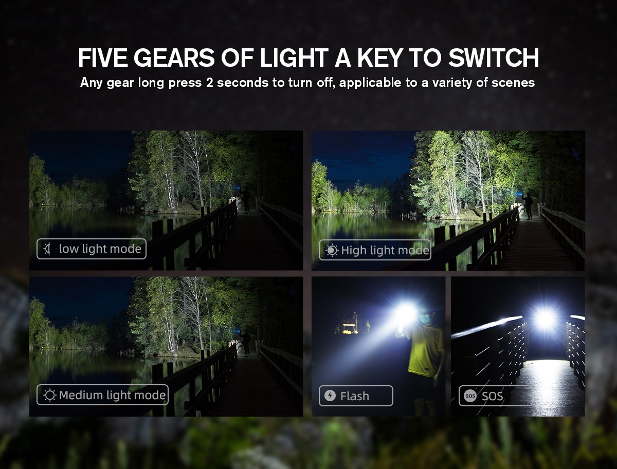 Mode: Low light-Medium light-Strong light-Strobe-SOS-off