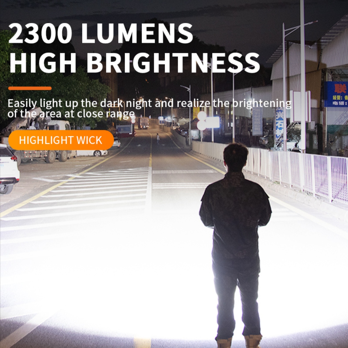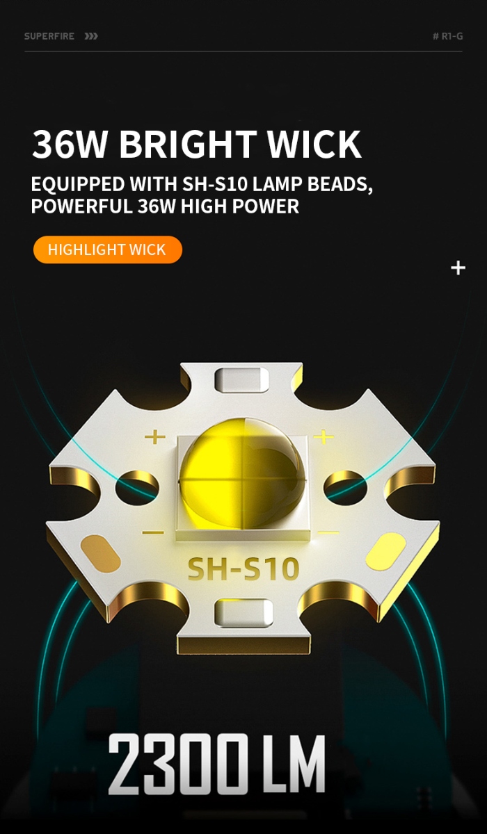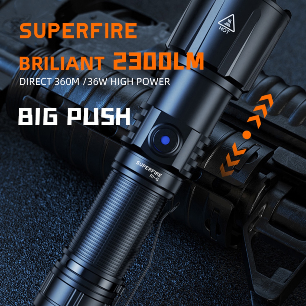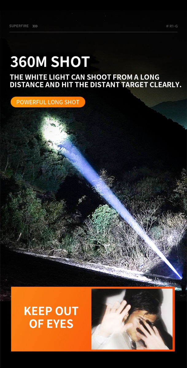 Equipped with a 36W high-power highlight wick, the R1-G delivers an impressive 2300 lumens of brightness. The telescopic focus function allows you to direct the light up to 360 meters, ensuring clear visibility in the darkest of environments.Featuring Type-C convenient charging, the R1-G offers a hassle-free charging experience. With a 5200mAh battery, this flashlight provides a runtime of approximately 6 hours, ensuring reliable and prolonged illumination.The R1-G boasts a free and portable design, allowing you to carry it effortlessly wherever your adventures take you. Its lightweight construction (190g) and compact size (156*46*34mm) make it an ideal companion for camping, hiking, or any outdoor activity.Safety is a priority with the R1-G. Multiple safety procedures, including anti-reverse connection, anti-overcharge, anti-overdischarge, low voltage shutdown, and low-pressure reminder, ensure secure usage and reliable lighting.The R1-G's powerful 36W high-power highlight wick enables a remarkable 360m shot. The white light can reach distant targets clearly, providing a reliable solution for long-distance visibility.The central switch on the R1-G allows for easy operation. Single press to turn on the flashlight, and continuous pressing achieves five-level dimming (weak-medium-strong-strobe-SOS). Double-click the button for quick bright light. Additionally, it serves as an emergency power bank with a USB discharge interface. The R1-G goes beyond being just a flashlight. With its USB discharge interface, it can supply power for low-voltage electronic equipment, making it a valuable tool for emergency charging and auxiliary lighting during casual walks or while walking the dog.