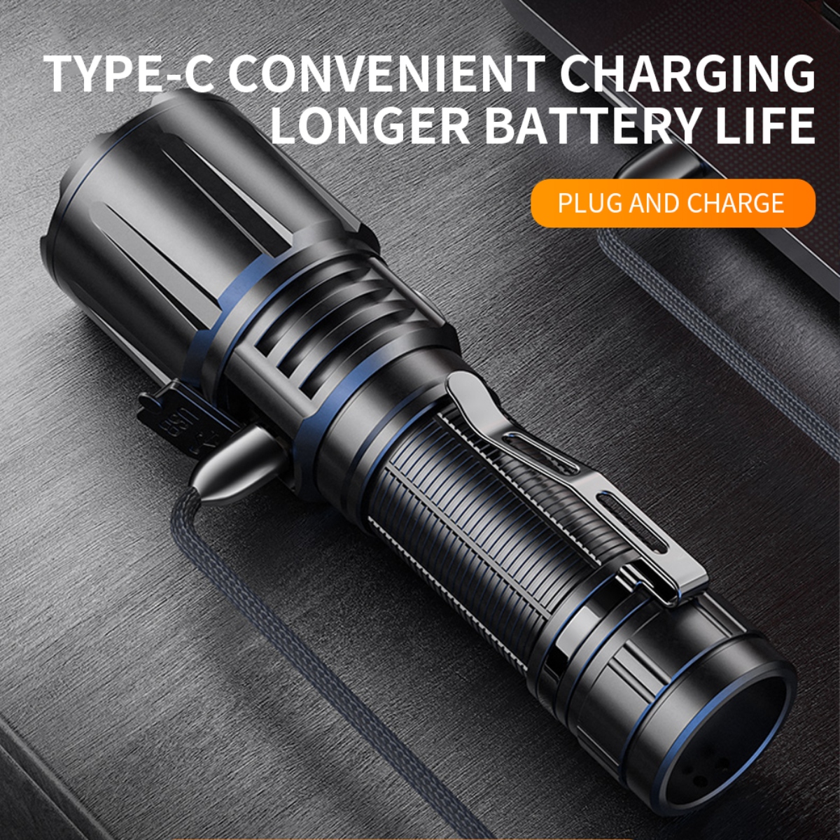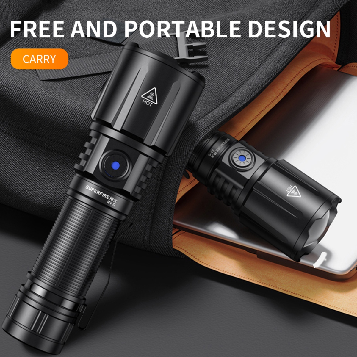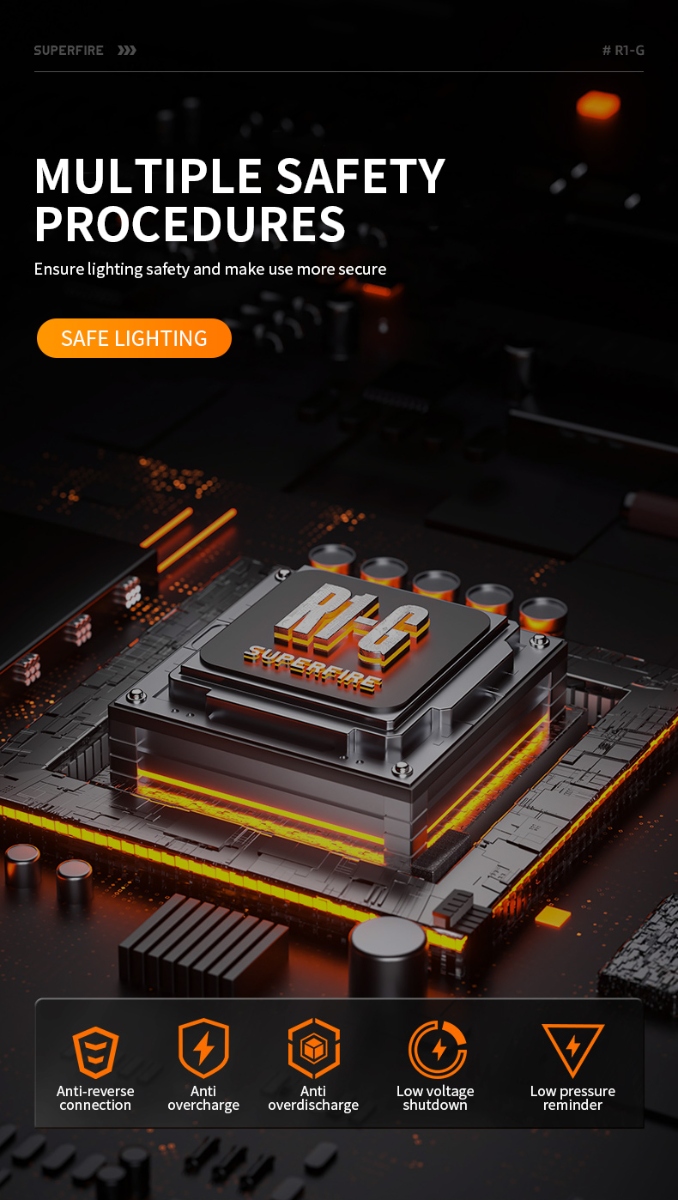 Equipped with a 36W high-power highlight wick, the R1-G delivers an impressive 2300 lumens of brightness. The telescopic focus function allows you to direct the light up to 360 meters, ensuring clear visibility in the darkest of environments.Featuring Type-C convenient charging, the R1-G offers a hassle-free charging experience. With a 5200mAh battery, this flashlight provides a runtime of approximately 6 hours, ensuring reliable and prolonged illumination.The R1-G boasts a free and portable design, allowing you to carry it effortlessly wherever your adventures take you. Its lightweight construction (190g) and compact size (156*46*34mm) make it an ideal companion for camping, hiking, or any outdoor activity.Safety is a priority with the R1-G. Multiple safety procedures, including anti-reverse connection, anti-overcharge, anti-overdischarge, low voltage shutdown, and low-pressure reminder, ensure secure usage and reliable lighting.The R1-G's powerful 36W high-power highlight wick enables a remarkable 360m shot. The white light can reach distant targets clearly, providing a reliable solution for long-distance visibility.The central switch on the R1-G allows for easy operation. Single press to turn on the flashlight, and continuous pressing achieves five-level dimming (weak-medium-strong-strobe-SOS). Double-click the button for quick bright light. Additionally, it serves as an emergency power bank with a USB discharge interface. The R1-G goes beyond being just a flashlight. With its USB discharge interface, it can supply power for low-voltage electronic equipment, making it a valuable tool for emergency charging and auxiliary lighting during casual walks or while walking the dog.