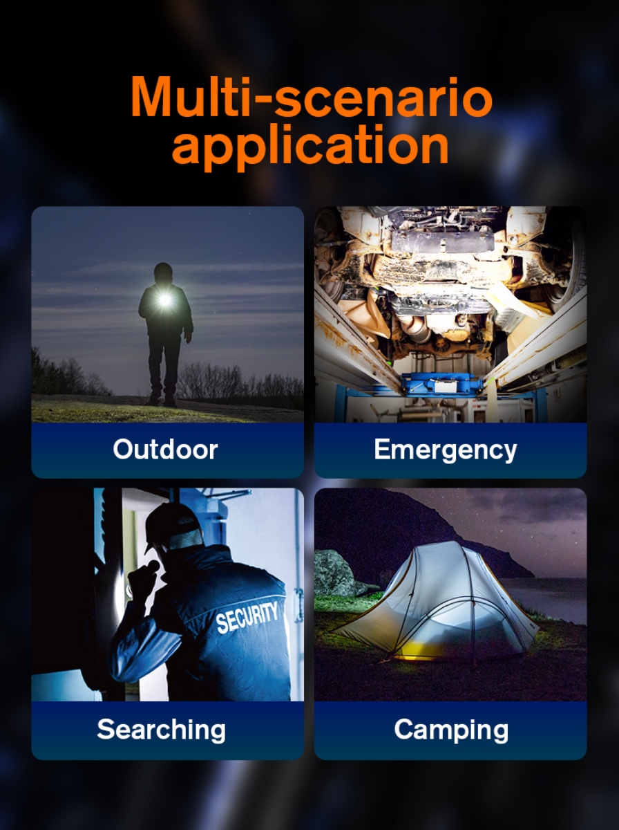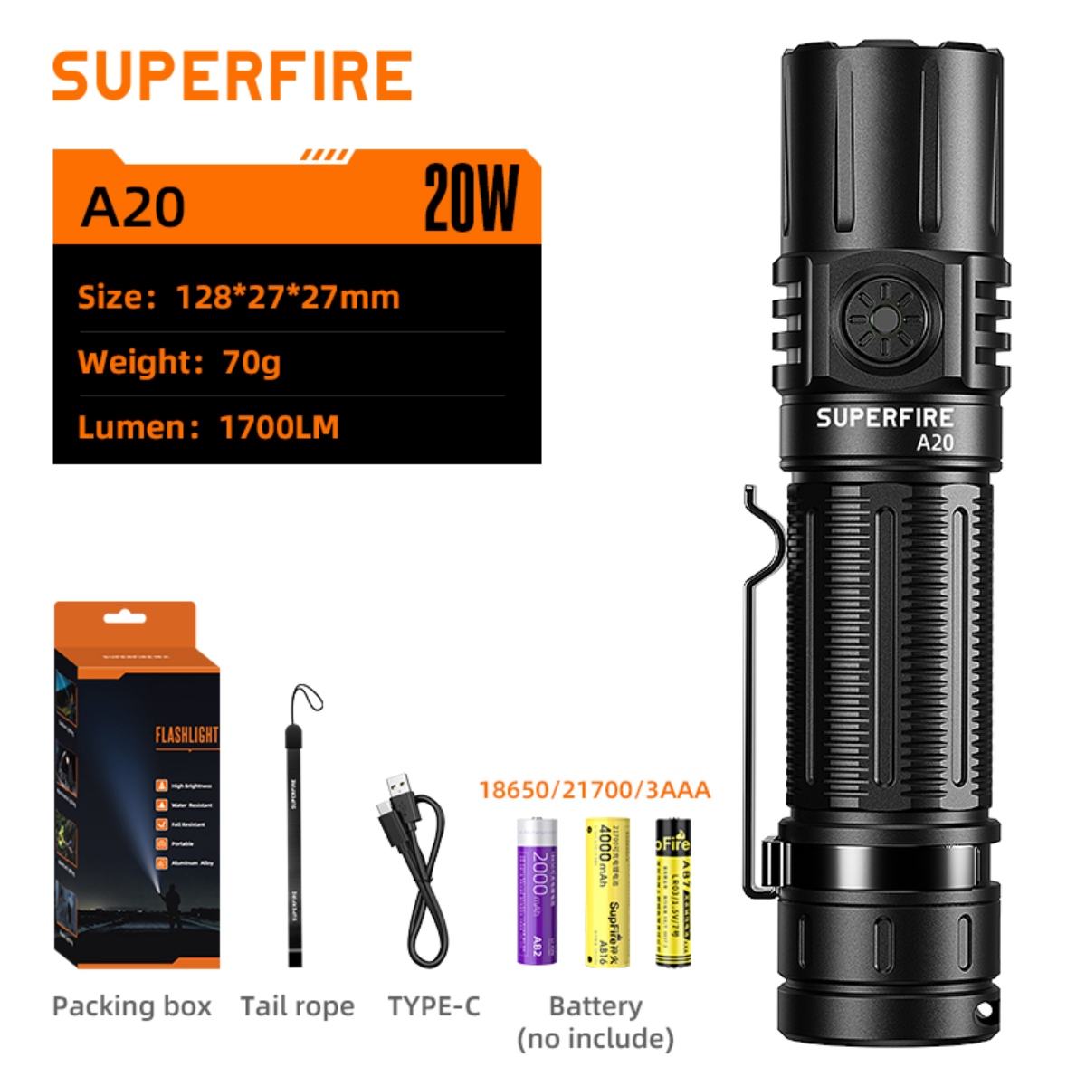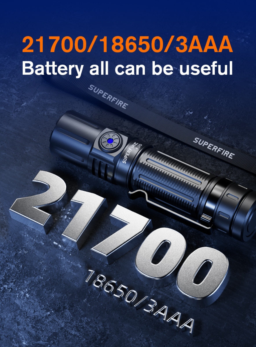 The A20 can be powered by 21700, 18650, or 3AAA batteries, ensuring that you can always find a suitable power source, no matter where you are. For added convenience, it's also equipped with a Type-C rechargeable port, making it easy to charge using various devices such as charging heads, computers, and power banks.The flashlight boasts an intelligent gear memory function. Simply press any gear for 2 seconds to turn it off, and when you turn it back on, it will remember your last selected brightness level, saving you time and effort.With an upgraded premium wick, the A20 delivers an astonishing 1700 lumens of light. This means a full moon spot, clear vision, and novisible grille. The light spot is even, and the visual effect is exceptional. The A20 offers a remarkable illumination range of up to 300 meters, making it perfect for those times when you need to see distant objects or explore the great outdoors. Its super-intensity lighting can be activated with a simple double-click, and you can easily cycle through different brightness modes by clicking the button.Crafted from high-quality aluminum alloy, the A20 is built to withstand the rigors of everyday use. It's also rated with an IP44 waterproof grade, ensuring it can handle various weather conditions.The A20 comes with five layers of protection, including anti-reverse connection, low-pressure reminder, anti-overcharge, over-discharge prevention, and low-voltage shutdown. The A20 is a compact and lightweight powerhouse, measuring just 128x27x27mm and weighing only 70g. It's easy to carry with its standard waist clip and portable tail rope, making it a perfect EDC (Everyday Carry) companion.