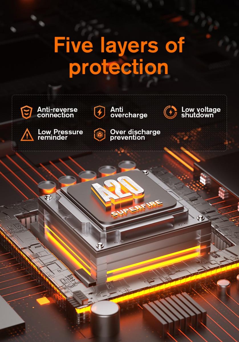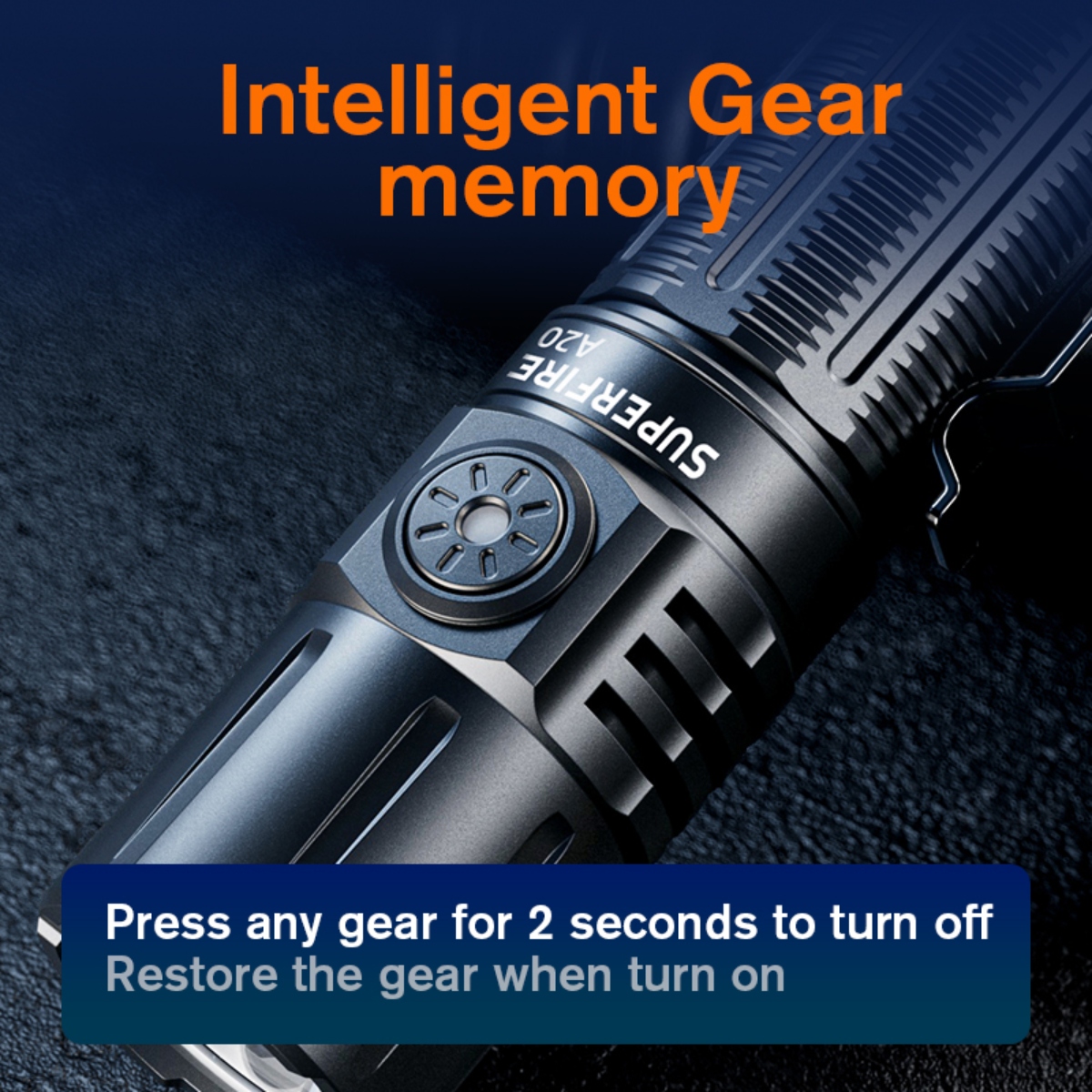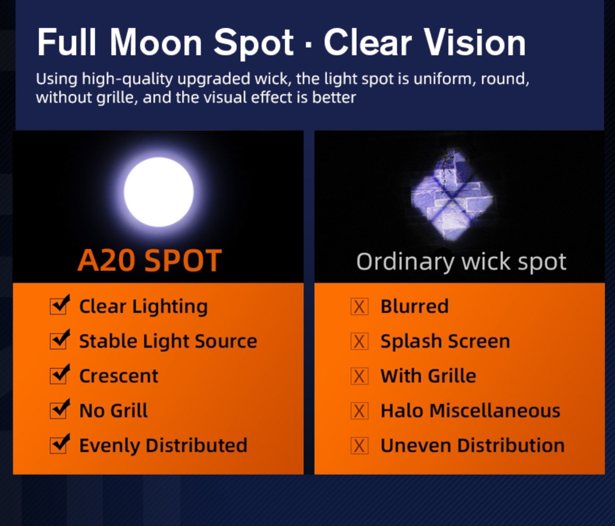 The A20 can be powered by 21700, 18650, or 3AAA batteries, ensuring that you can always find a suitable power source, no matter where you are. For added convenience, it's also equipped with a Type-C rechargeable port, making it easy to charge using various devices such as charging heads, computers, and power banks.The flashlight boasts an intelligent gear memory function. Simply press any gear for 2 seconds to turn it off, and when you turn it back on, it will remember your last selected brightness level, saving you time and effort.With an upgraded premium wick, the A20 delivers an astonishing 1700 lumens of light. This means a full moon spot, clear vision, and novisible grille. The light spot is even, and the visual effect is exceptional. The A20 offers a remarkable illumination range of up to 300 meters, making it perfect for those times when you need to see distant objects or explore the great outdoors. Its super-intensity lighting can be activated with a simple double-click, and you can easily cycle through different brightness modes by clicking the button.Crafted from high-quality aluminum alloy, the A20 is built to withstand the rigors of everyday use. It's also rated with an IP44 waterproof grade, ensuring it can handle various weather conditions.The A20 comes with five layers of protection, including anti-reverse connection, low-pressure reminder, anti-overcharge, over-discharge prevention, and low-voltage shutdown. The A20 is a compact and lightweight powerhouse, measuring just 128x27x27mm and weighing only 70g. It's easy to carry with its standard waist clip and portable tail rope, making it a perfect EDC (Everyday Carry) companion.