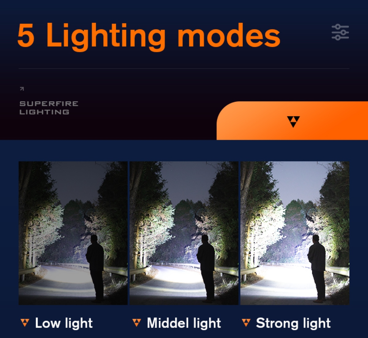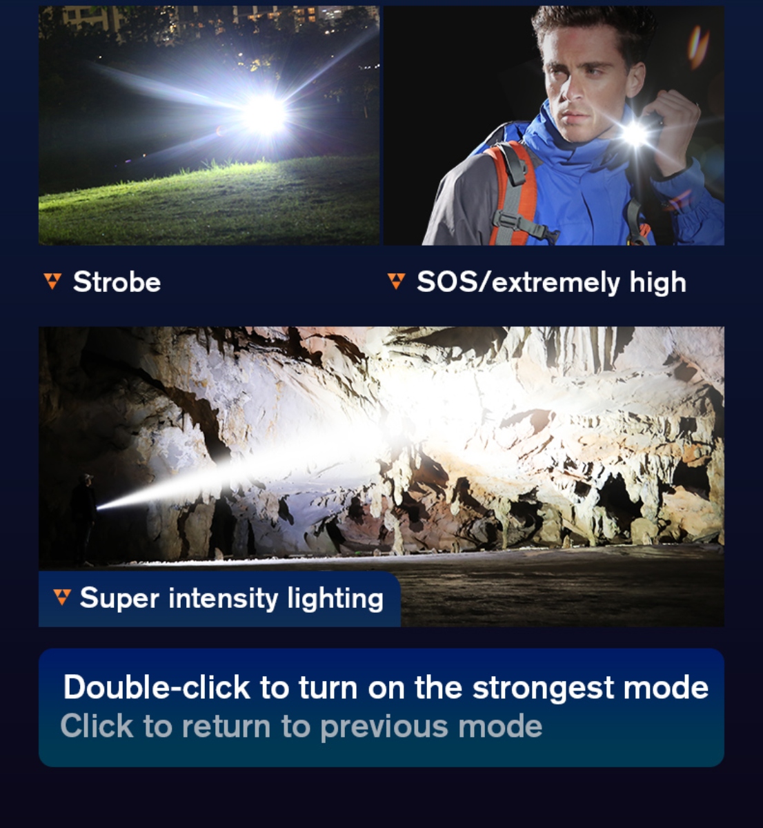 modes: Low-Medium-Strong-Strobe-SOS/extremely high(double click)