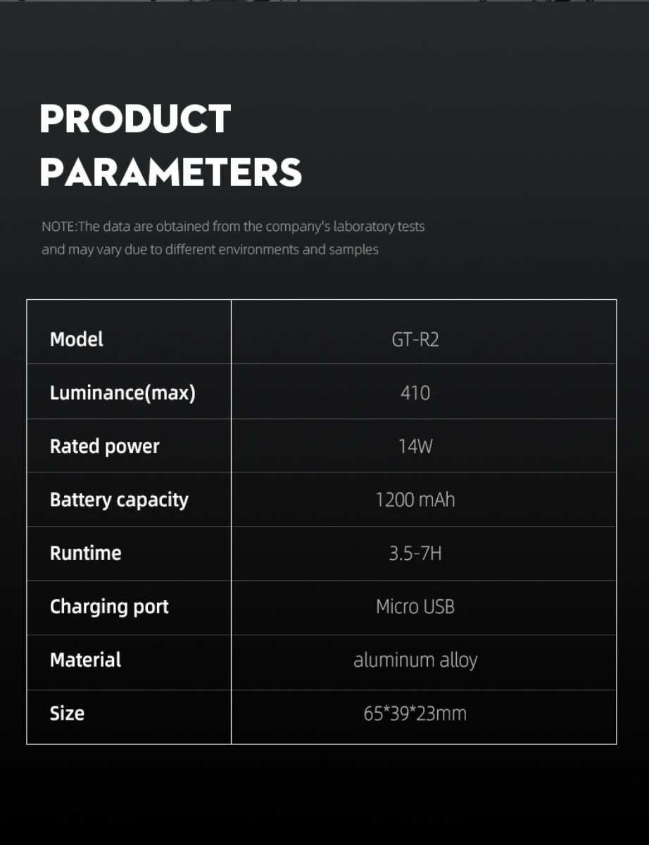 Modes 6 modes (100% floodlight>50% floodlight>100%spotlight>100%floodlight & 100% spotlight>breathing light>strobe)