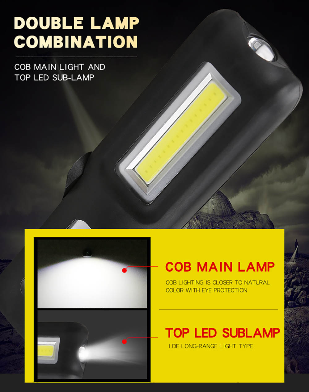 Light source CREE XPE LED(Top light)+COB(Side light)