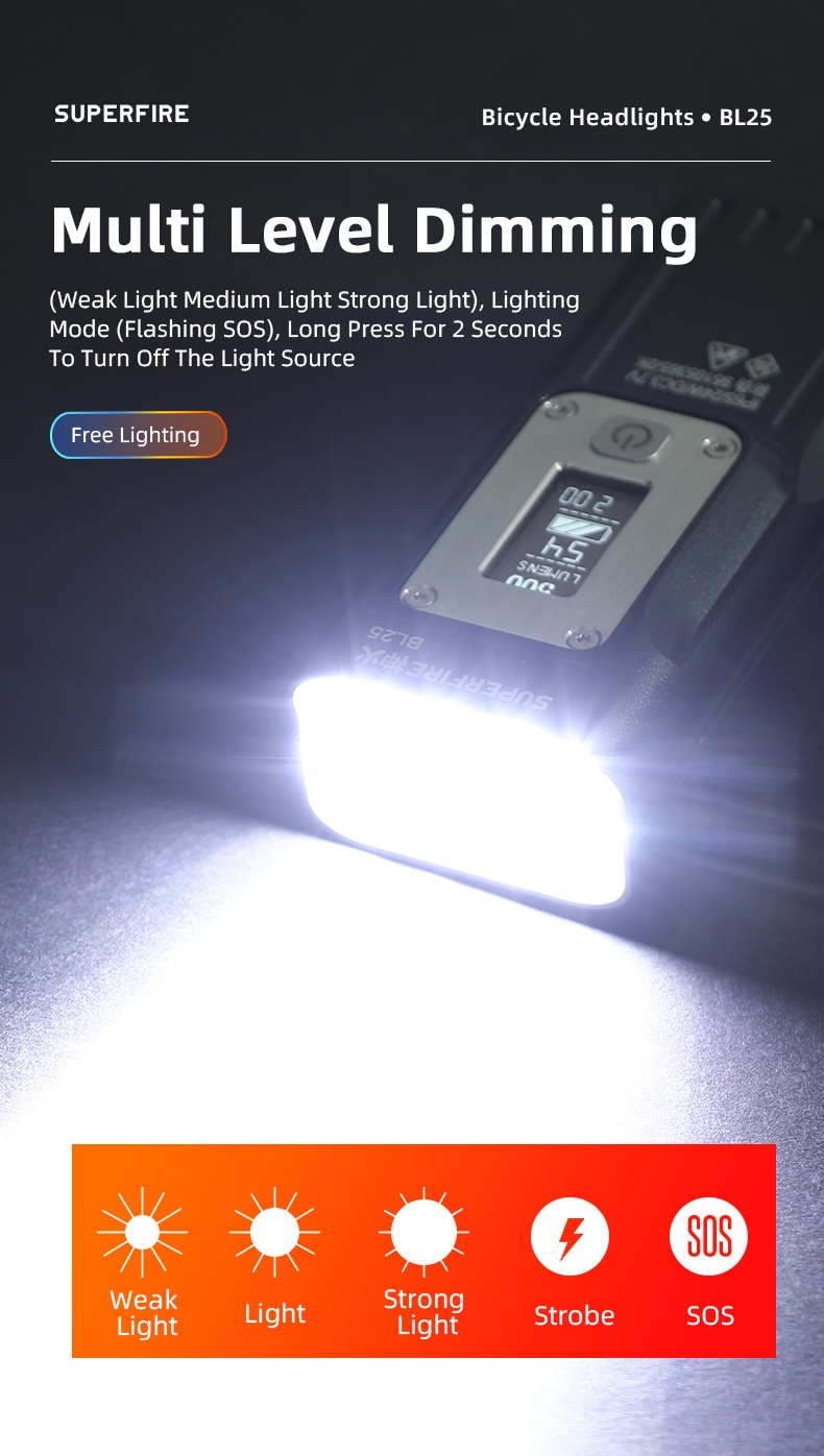 Modes:5 mode(strong light--middle light--low light--strobe--sos)