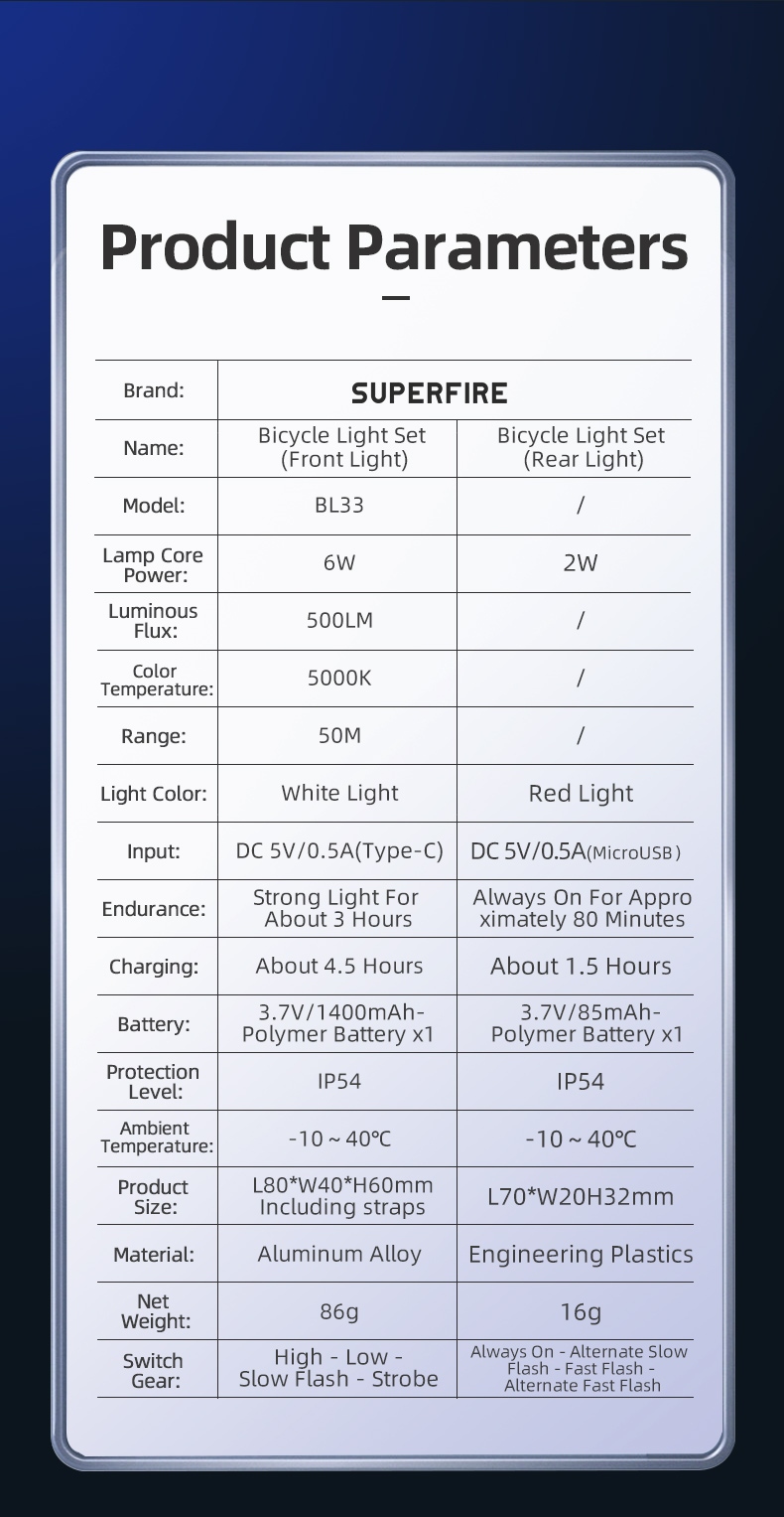 The BL33 is a bicycle light set that includes a front and a rear light. The front light, made of aluminum alloy, has a 6W power and 500LM brightness. It's rechargeable with a 1400mAh battery. The rear light, with a plastic shell, has a 2W power and red light. Suitable for cyclists who need reliable lighting during rides.