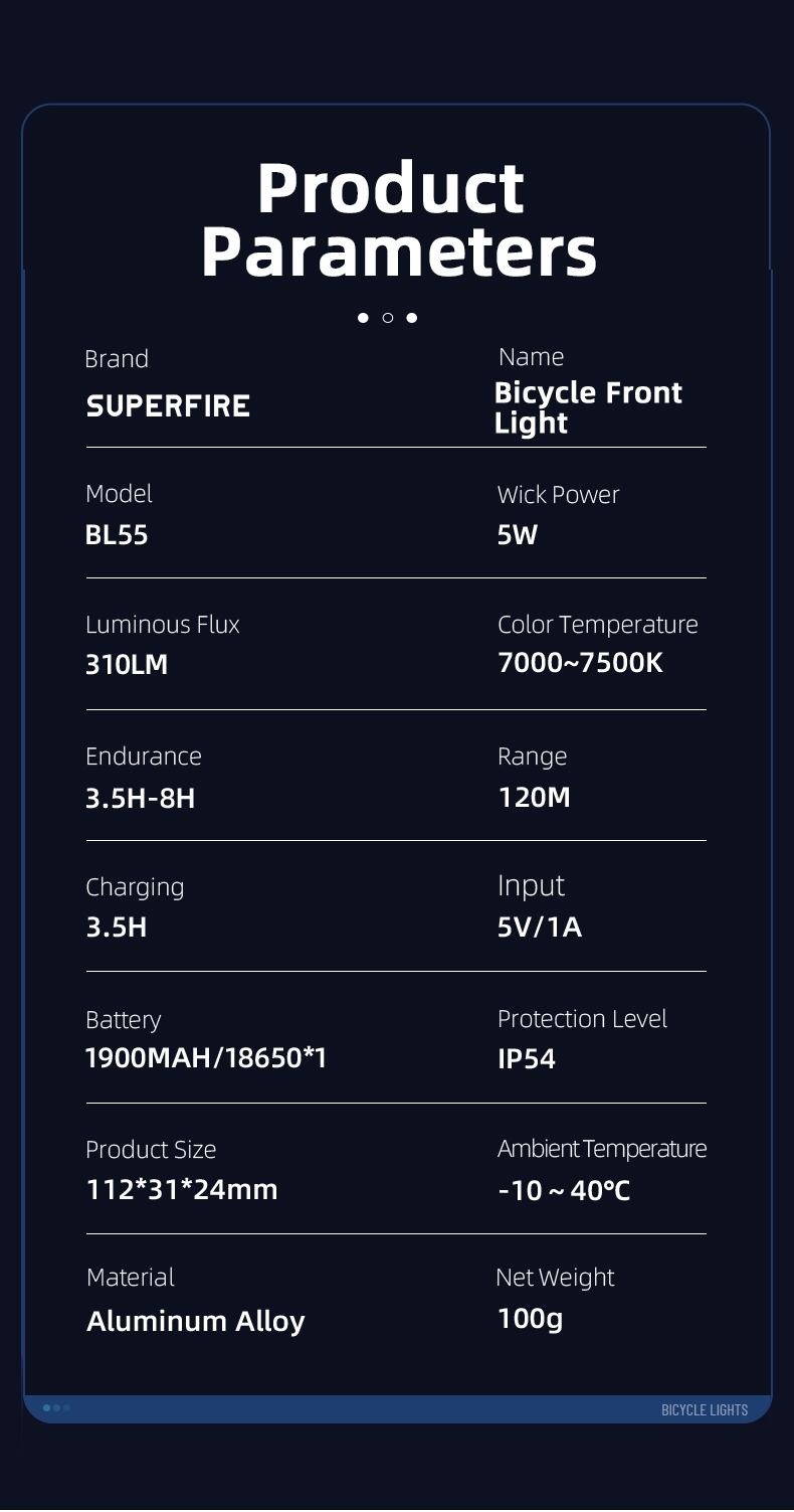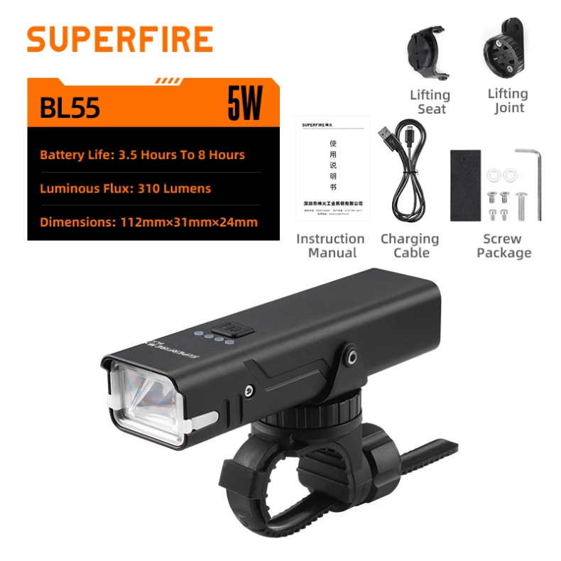 The BL55 Bicycle Front Light is a versatile and powerful LED headlight designed for cyclists who demand reliability and adaptability. With its 310-lumen output and impressive 120-meter beam distance, this aluminum alloy light ensures optimal visibility for various cycling conditions. Featuring a user-friendly interface, multiple lighting modes including a fog light function, and USB charging, the BL55 is the perfect companion for safe and comfortable riding in any environment.