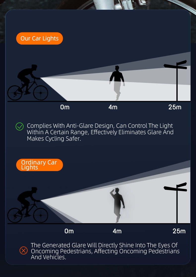 Complies With Anti-Glare Design, Can Control The Light Within A Certain Range, Effectively Eliminates Glare And Makes Cycling Safer.