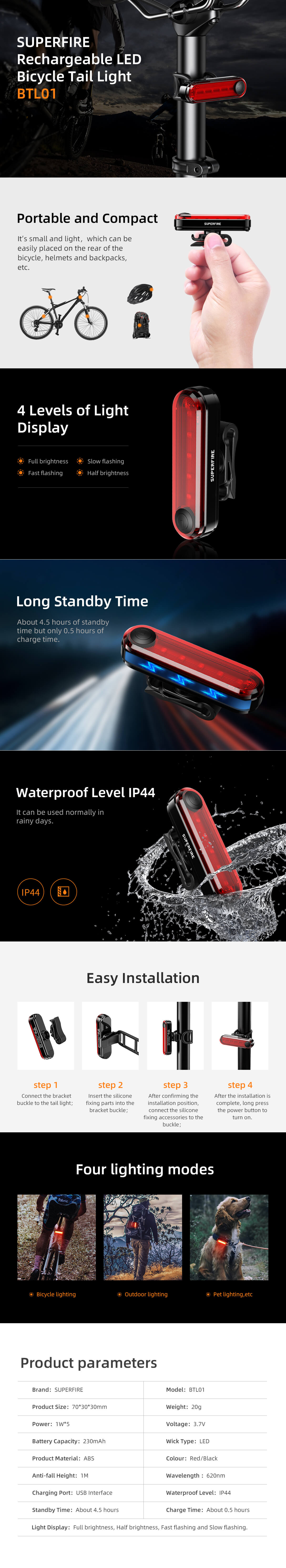 Home  > Products  > Outdoor Lights  > Bicycle Lights  > Bicycle Tail Light  > SUPERFIRE BTL01 Bicycle Tail Light