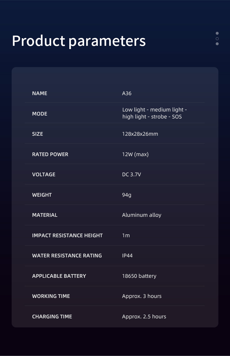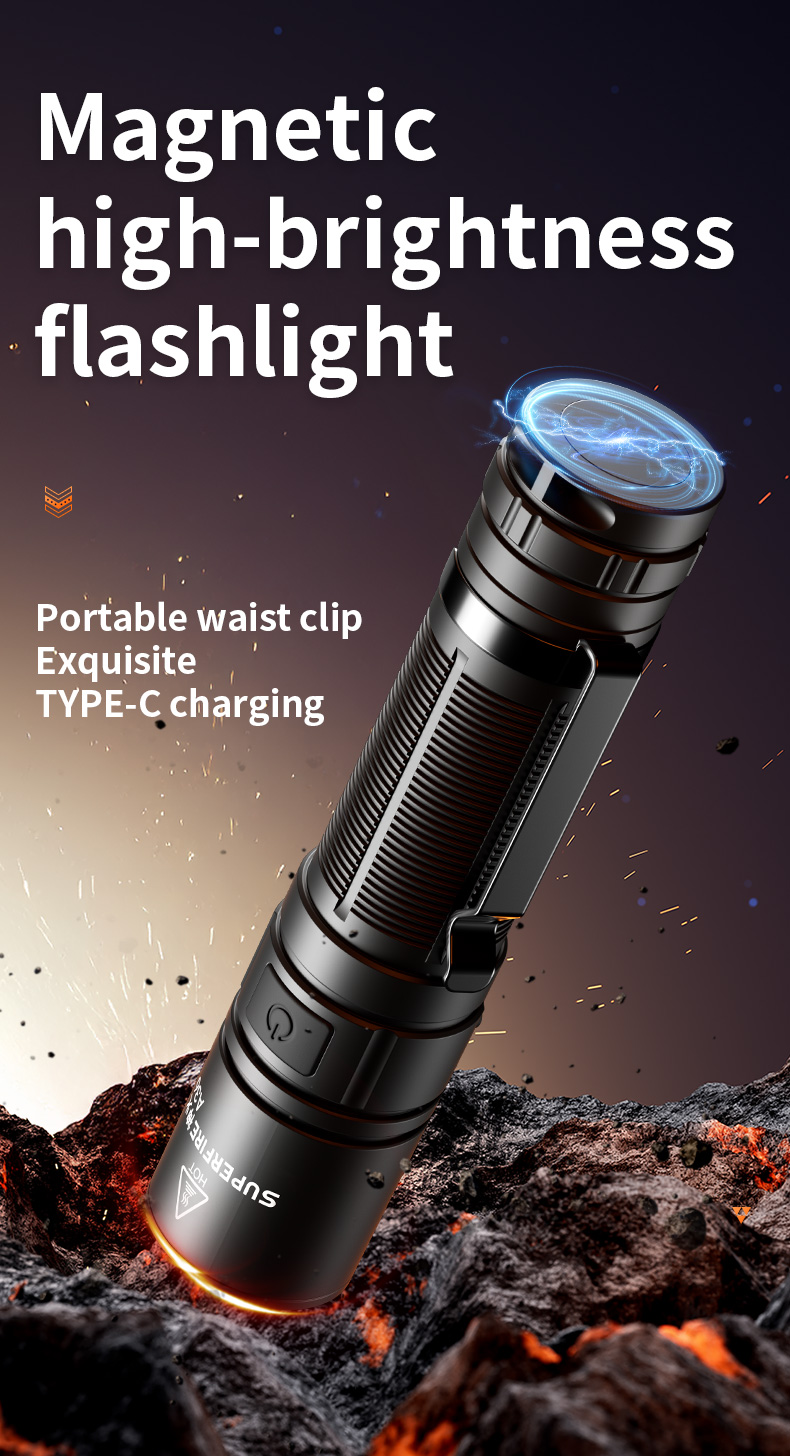 Superfire multi-mode EDC flashlight A36, designed to meet diverse lighting needs. Featuring multiple safety programs, it ensures secure use and prolongs lifespan. Its sleek, compact design makes it stylish and easy to handle. The fixed-focus feature allows for simple one-handed operation, while high-brightness LED beads provide superior illumination. Constructed from durable aluminum alloy, it is waterproof and impact-resistant. The Type-C charging make it convenient to recharge, and included accessories like a belt clip, magnetic base, and wrist strap enhance portability.