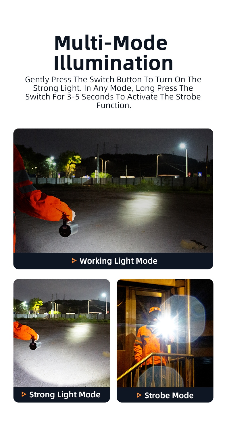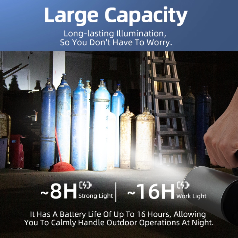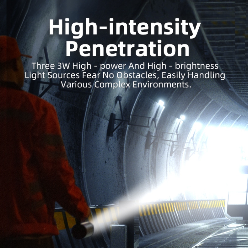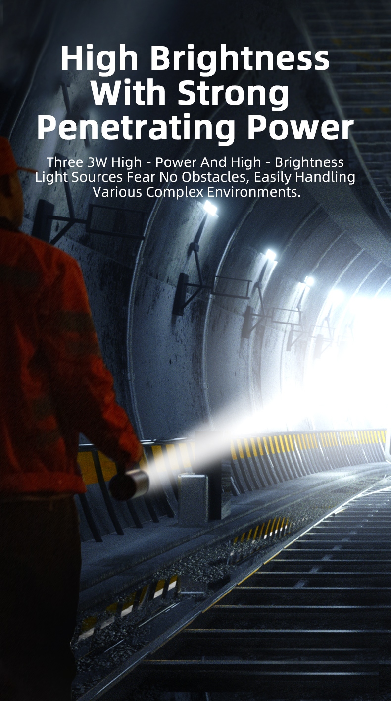 Equipped with 3x3W high-power LED bulbs, this ultra-bright flashlight delivers exceptional penetration, cutting through smoke, fog, and harsh environments with ease. Its high-capacity battery ensures up to 16 hours of runtime, providing uninterrupted lighting for extended outdoor work.