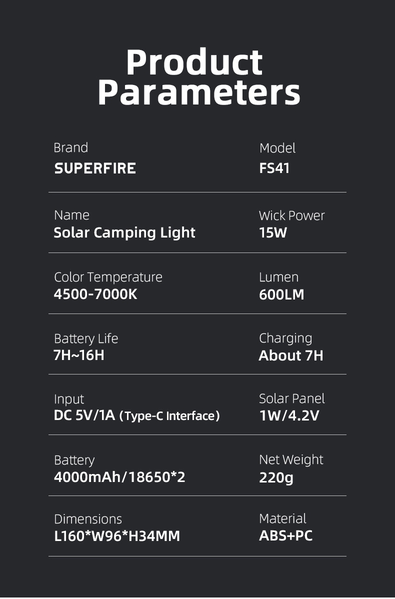 The FS41 Solar Camping Light is a versatile and eco-friendly lighting solution designed for outdoor enthusiasts and campers. With its powerful 600-lumen output and innovative 4-in-1 lighting modes, this compact lantern adapts to various outdoor scenarios. Featuring both solar and Type-C charging options, a long-lasting battery life of up to 16 hours, and convenient mounting options, the FS41 is your reliable companion for illuminating your outdoor adventures.