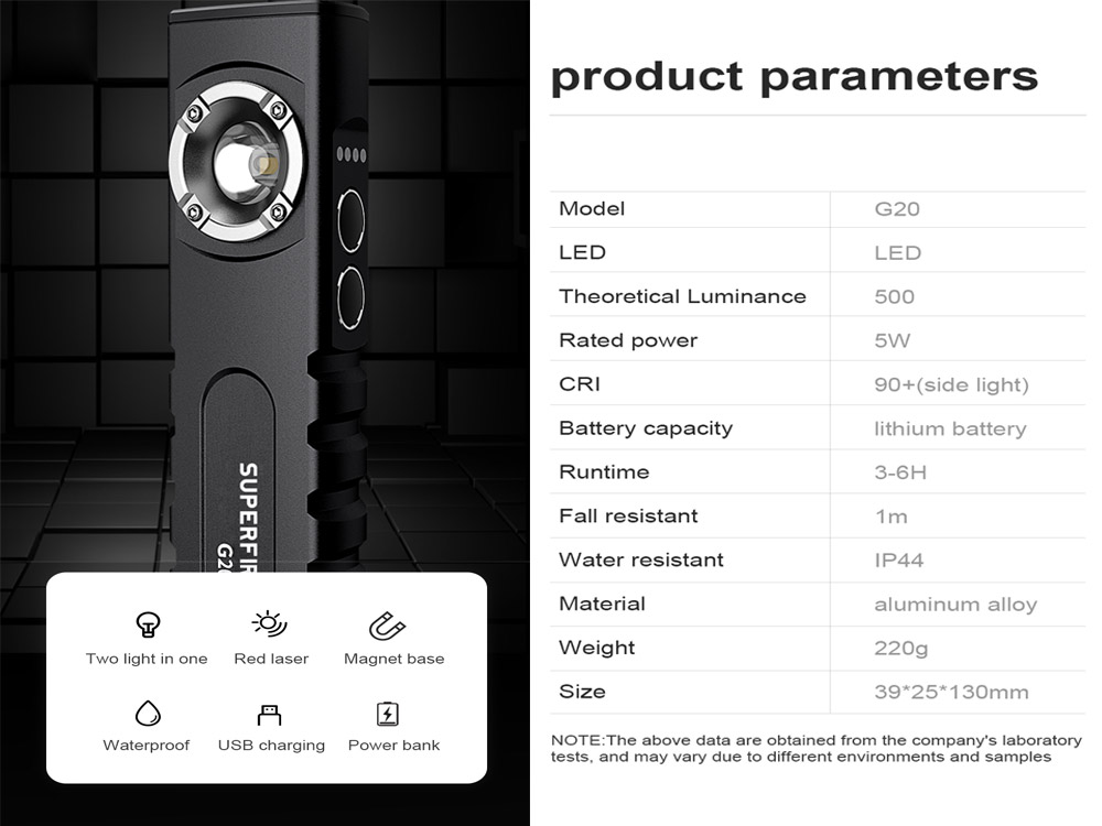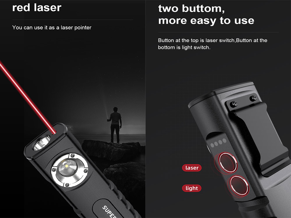 The SUPERFIRE G20 is a versatile, high-performance flashlight designed for various outdoor activities and emergency situations. With its dual LED lights, laser pointer, and multiple mounting options, the G20 offers exceptional illumination and functionality in a compact, durable package. Featuring USB-C charging, power bank function, and adjustable brightness, this flashlight is perfect for camping, hiking, DIY projects, and emergency preparedness.