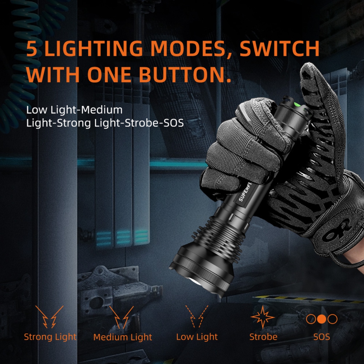 Modes:5 modes (Low>Med>High>strobe>SOS)