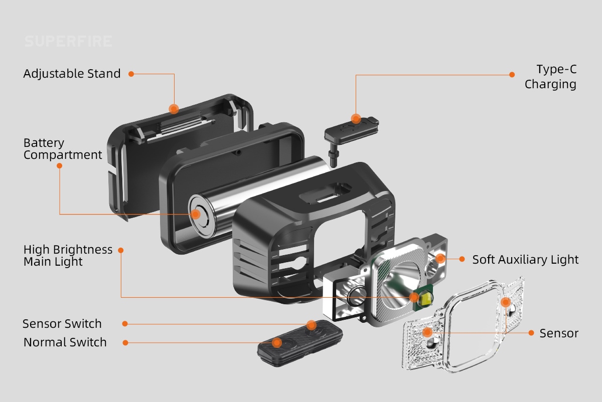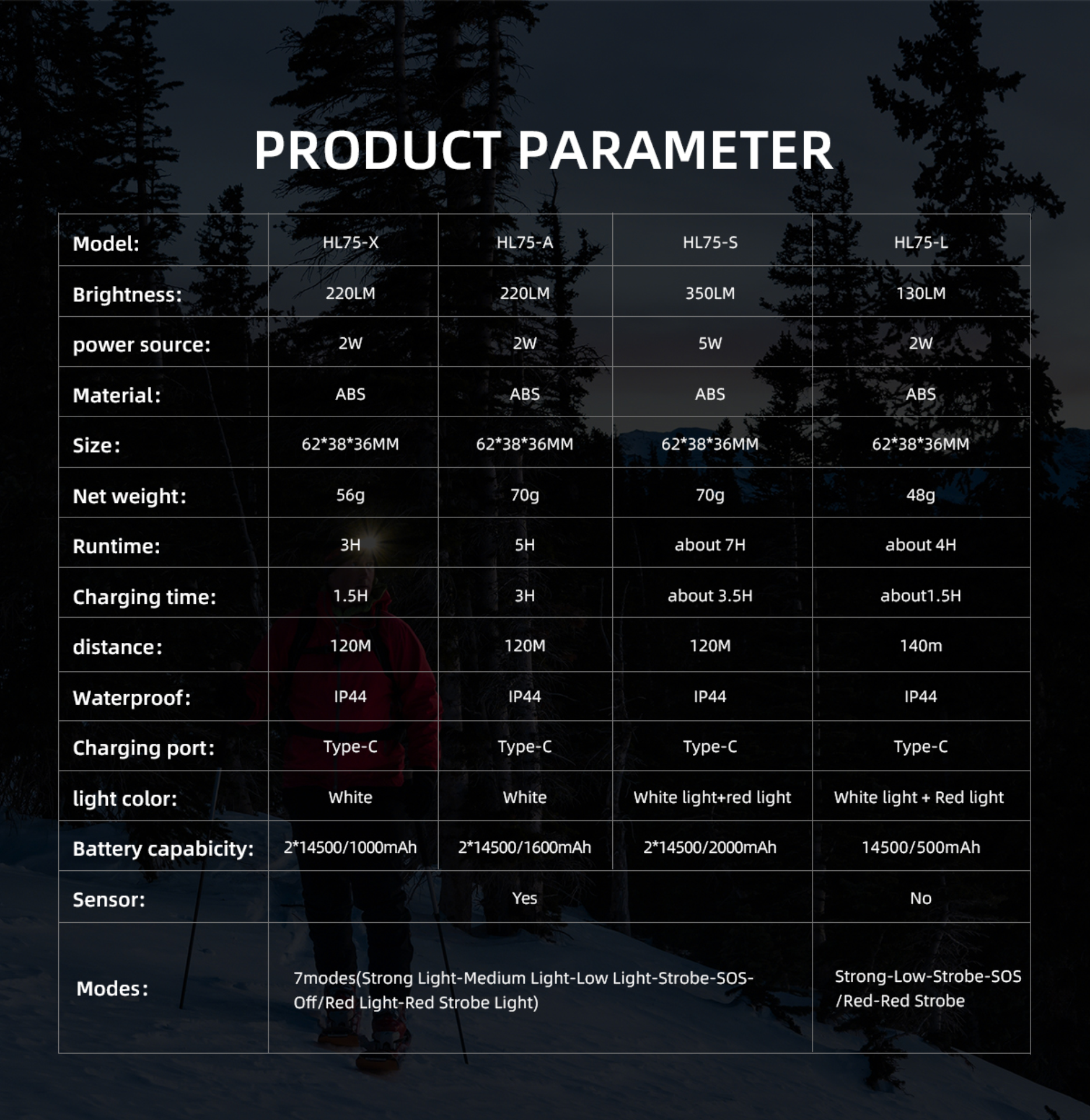 This headlamp has a maximum output of 350 lumens and comes with a 2*14500 battery. It can be used in low temperature environments, and has the function of being dustproof and waterproof.It uses a type-c interface that can improve charging efficiency and prolong battery life.It equips with 7modes(Strong Light-Medium Light-Low Light-Strobe-SOS-Off/Red Light-Red Strobe Light), for optimal use in different circumstances.