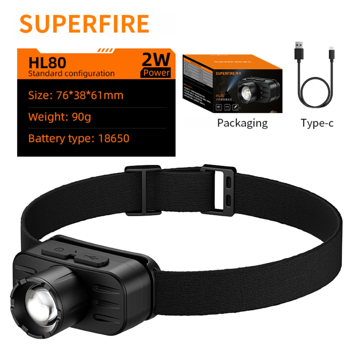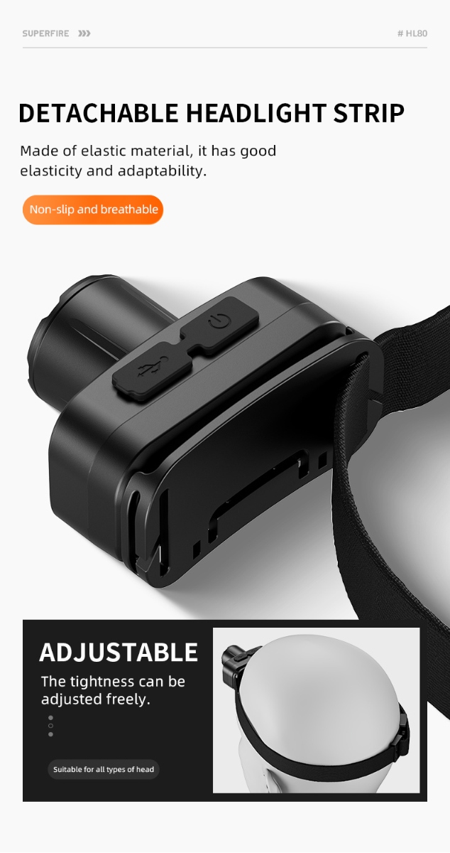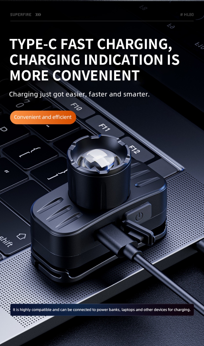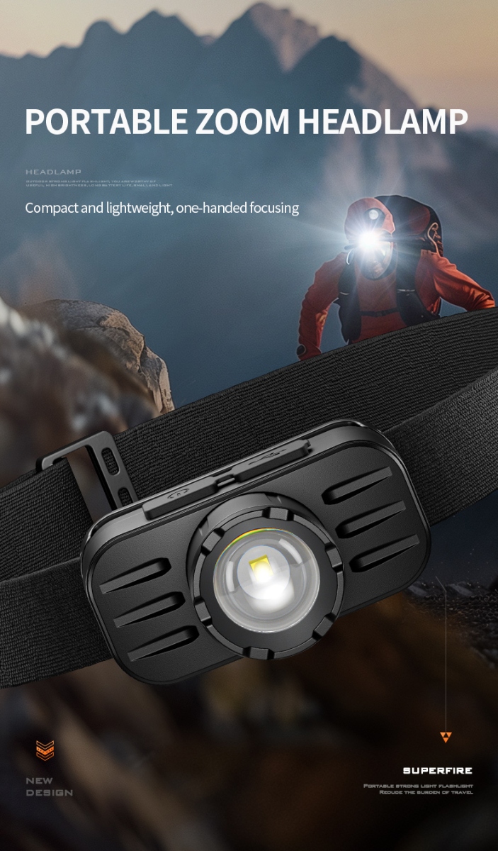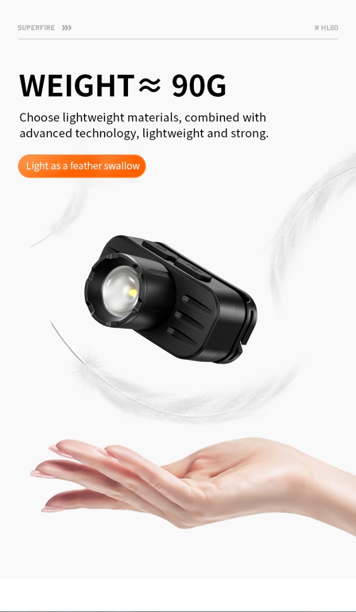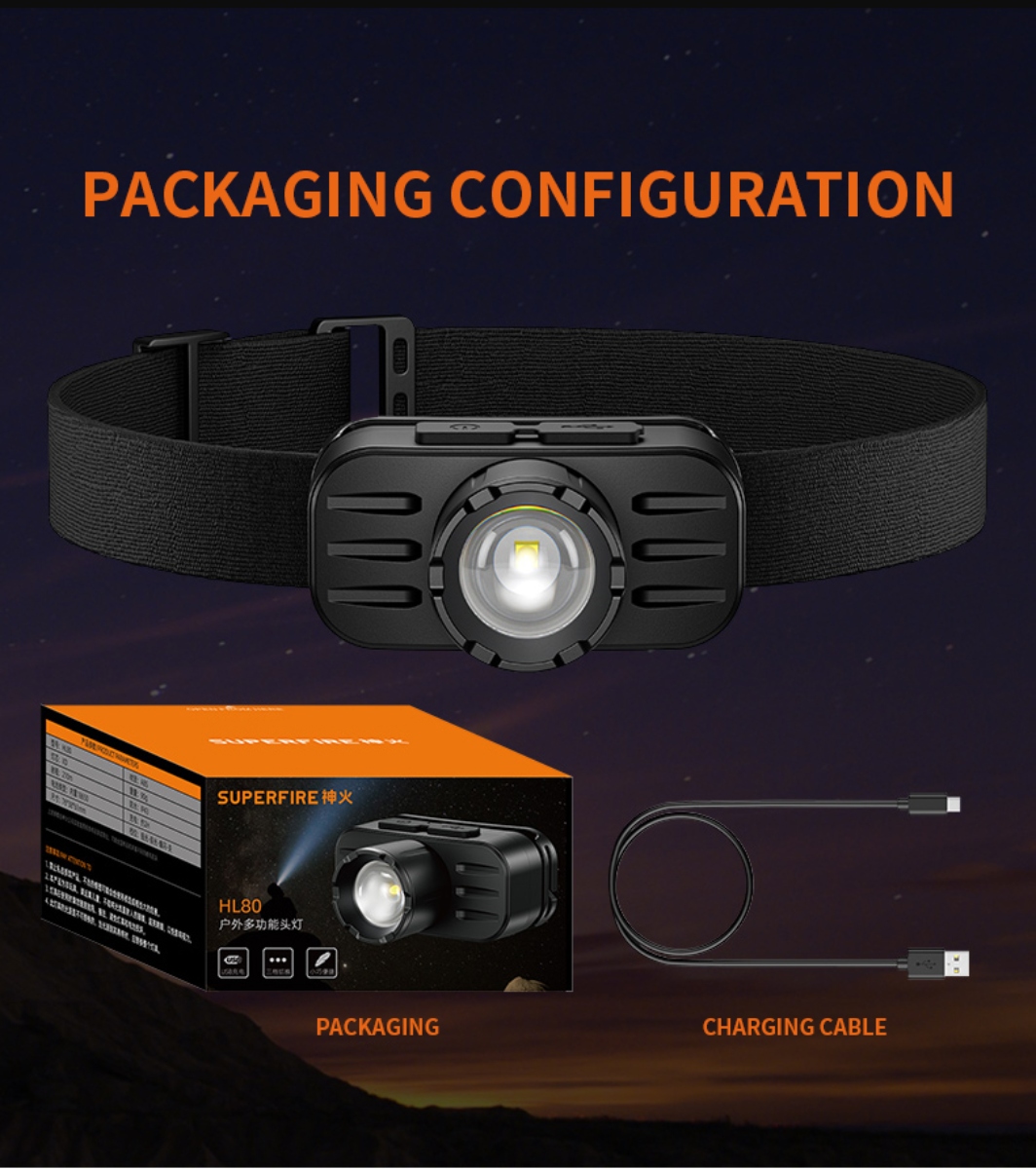 The SUPERFIRE HL80 is a powerful and compact zoom headlamp perfect for a variety of outdoor activities and work environments.By rotating the lamp head to switch between focus and floodlight, users can adjust the beam range as needed to facilitate use in different environments.Provides multiple lighting modes, including high brightness, low brightness and flashing mode, to meet the needs of different scenes. Built-in rechargeable battery, charging via USB port, convenient and fast.The SUPERFIRE HL80 headlamp is a reliable lighting tool that can provide excellent lighting performance whether it is for daily use or emergency needs in special environments.