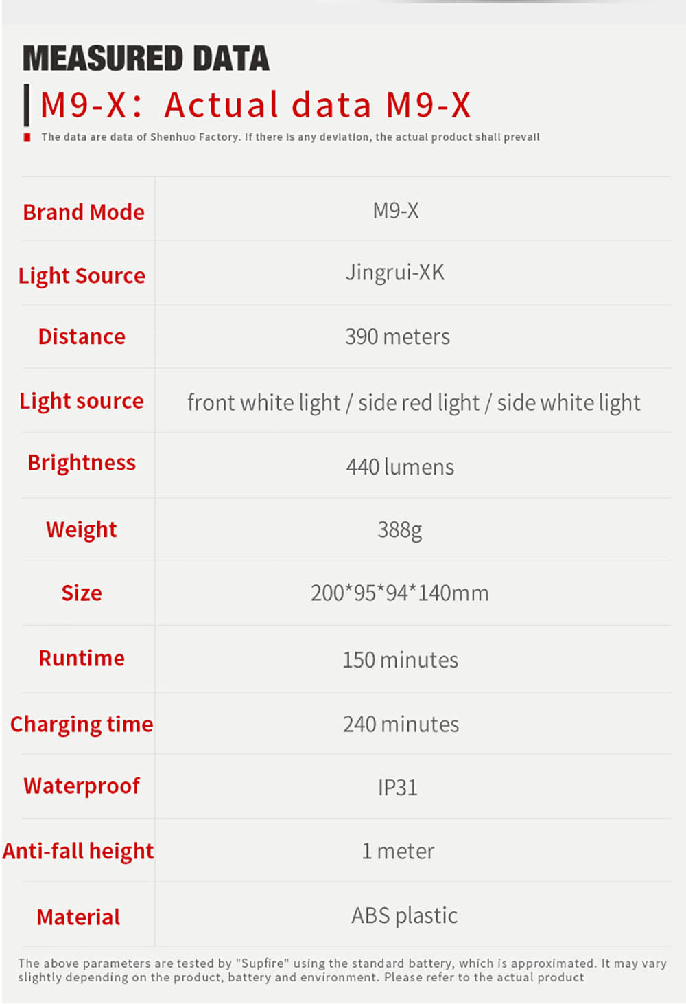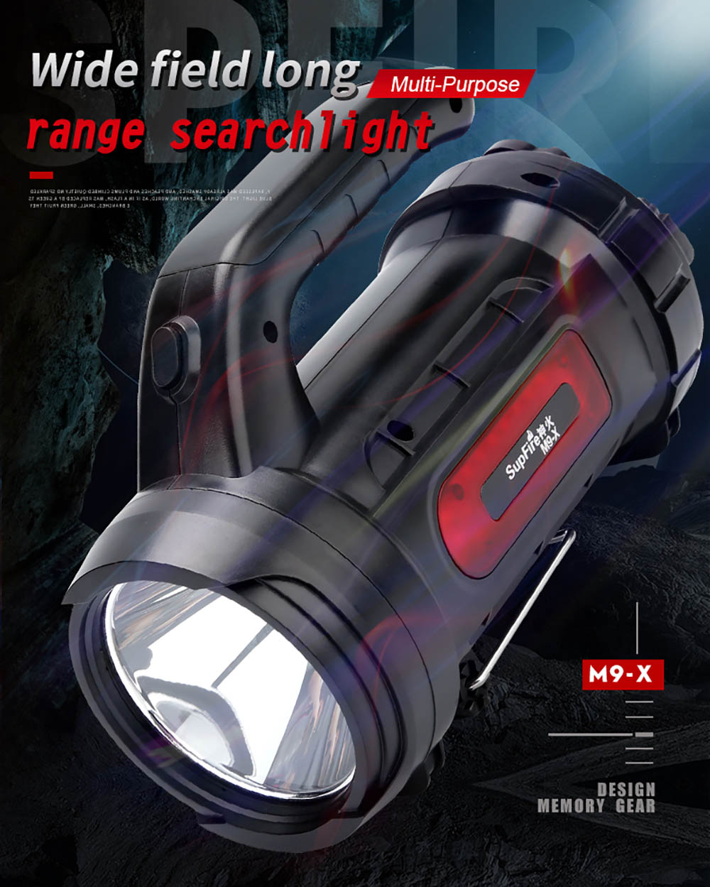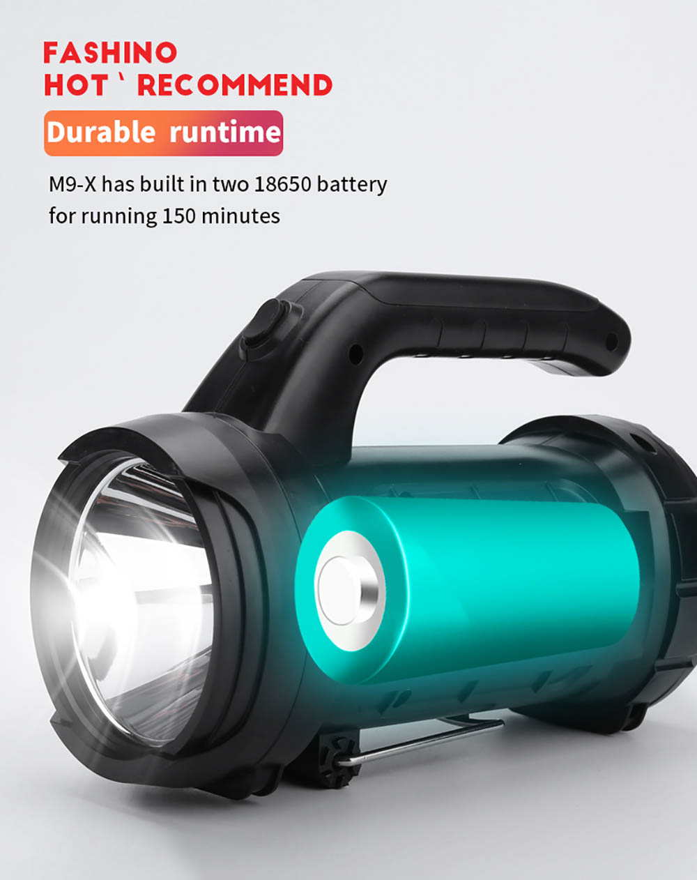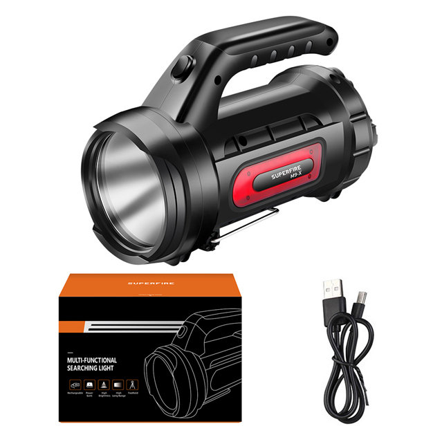With its impressive beam distance of 390 meters, this searchlight can cut through the darkness, offering a clear line of sight even in the most challenging environments.This searchlight is more than just a lighting tool; it's a multi-purpose powerhouse. Equipped with a USB smart charging port and a built-in power bank function, the M9-X lets you charge your electronic devices on the go, ensuring your outdoor travels are as convenient as they are well-illuminated. It's your reliable companion for staying connected, even in the great outdoors.The M9-X is powered by two high-capacity 18650 batteries, offering an impressive runtime of 150 minutes. No need to worry about your light dimming when you need it most. This searchlight will keep you illuminated for extended periods, ensuring you can focus on your tasks or adventures without interruptions.Featuring the JingRui XK power lightwick, the M9-X produces a bright and consistent 440 lumens of light. Whether you're at home during a power outage or in the great outdoors, this searchlight will provide you with the illumination you need to see clearly and get things done.The M9-X is packed with practical design elements. It includes a bottom bracket for added stability during activities like outdoor night fishing, where a steady flashlight is essential. The tail of the searchlight is equipped with a suspension hook, making it convenient for outdoor camping and maintenance tasks, such as car inspections.Keeping track of your battery status is a breeze with the M9-X. It features a power indicator switch at the tail, allowing you to check the battery level with a simple press. Say goodbye to unexpected power outages in the middle of your adventures.Crafted from durable ABS plastic and boasting an IP31 waterproof rating, the M9-X is designed to withstand the demands of outdoor use. It can handle the occasional splashes and rain, so you can trust it to perform in various weather conditions.