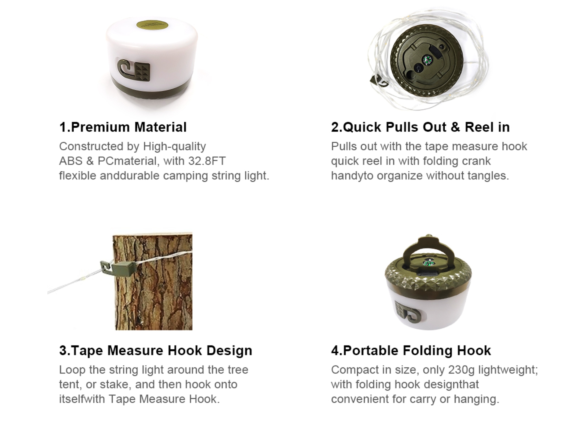 Constructed by High-quality ABS & PC material, with 32.8FT flexible and durable camping string light.