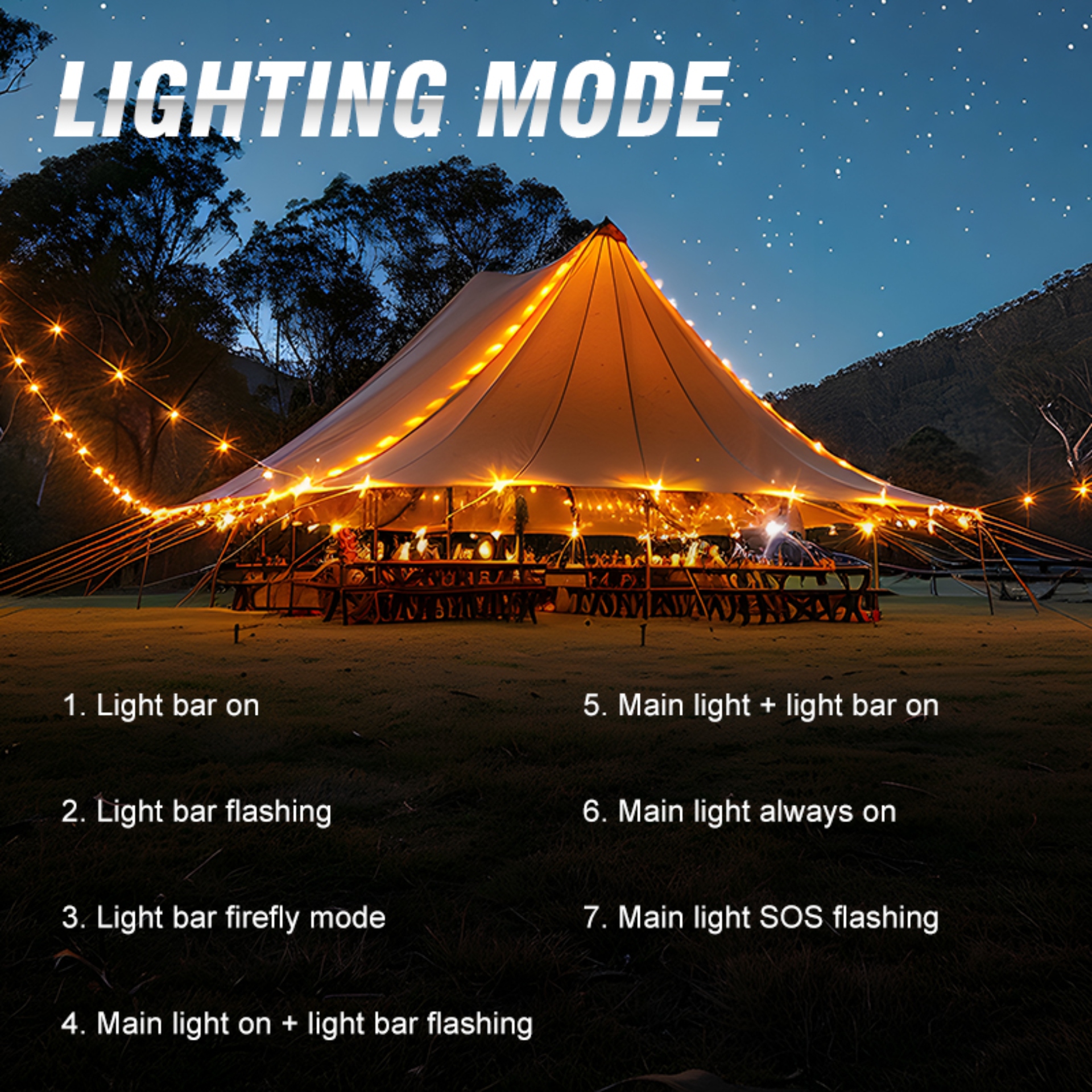 Lighting mode: Light bar on-Light bar flashing-Light bar firefly mode-Main light on+Light bar flashing Main light+Light bar on-Main light always on-Main light SOS flashing