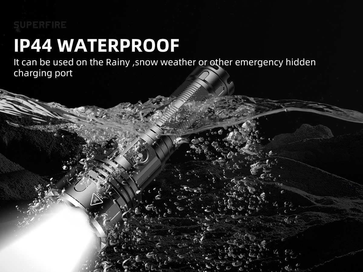 This tactical brightest rechargeable flashlight features 36W high power source up to 2700 lumens. It can be charged through a type-c cable or uesd as a power bank to charge mobile phones. This waterproof flashlight comes with an emergency hidden charging port and is IP44 waterproof. So it can be used in rainy or snowy days.