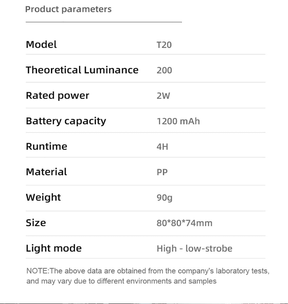 Gear | Four gears (strong-weak-strobe-SOS) | Range(m) | 5 | 3.5 |
