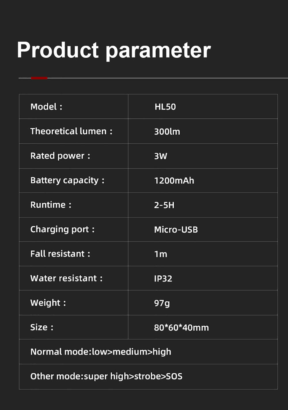 Powered by the JIGNRUI XD light source, this headlamp emits a brilliant 150 lumens, ensuring a clear and well-defined beam. With a reach of up to 200 meters, the zoomable feature enables long-range visibility and a precise focus on your surroundings. Crafted from a blend of ABS and aluminum, the HL50 is both durable and lightweight. Its adjustable angle and high elastic belt ensure a comfortable fit and adaptability to your specific needs, making it perfect for various activities, regardless of the environment.The headlamp offers four modes - High, Low, Strobe, and an SOS function, activated by a 2-second press. This versatility ensures you have the right lighting for any situation, from illuminating your path during a run to signaling for help in an emergency.Featuring a Micro-USB charging port, the HL50 is designed for hassle-free recharging, taking just 2.5 hours for a full charge. The 1200mAh 18650 battery provides a runtime of 2 hours, ensuring extended usage without frequent recharges.The headlamp boasts an IP32 waterproof rating, allowing you to use it in light rain. The charging indicator, displaying red during charging and blue upon full charge, keeps you informed about the battery status.From outdoor adventures to emergency situations, the HL50 is the ideal companion. Its portable and rechargeable design makes it suitable for runners, campers, hikers, or anyone needing hands-free, reliable lighting.