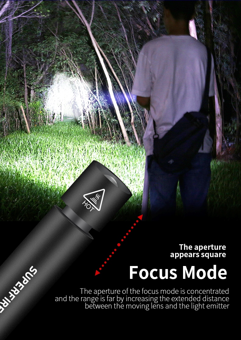 1. Zoomable Focus: Adjust beam from spot to flood lighting with one-handed sliding operation.