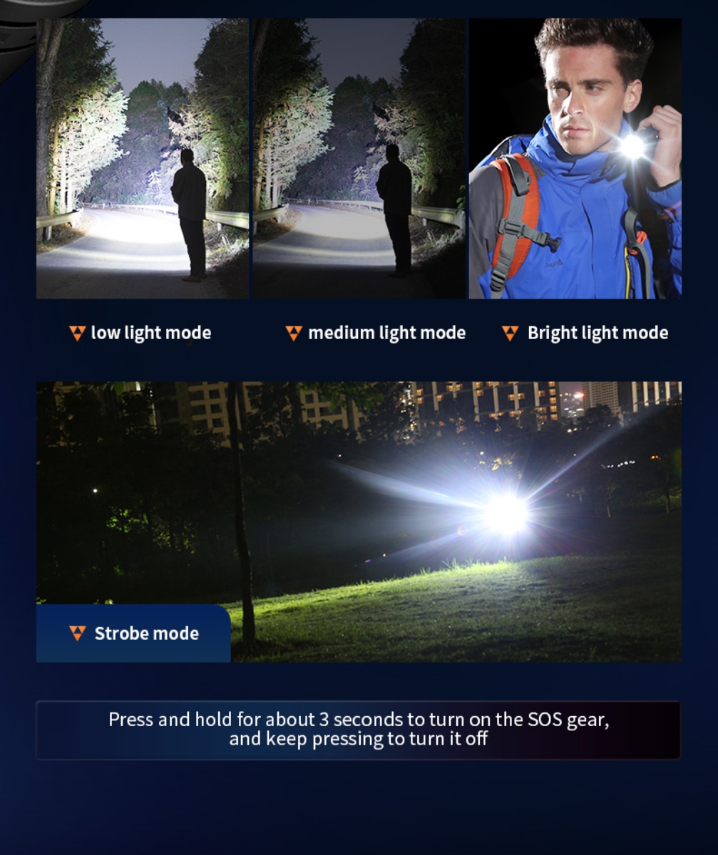 4.Four modes:Strong-Low-Strobe-Off/SOS