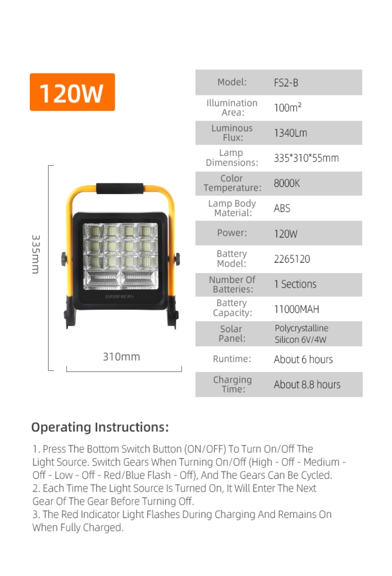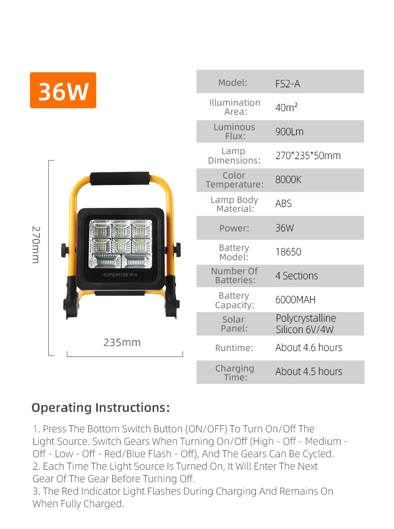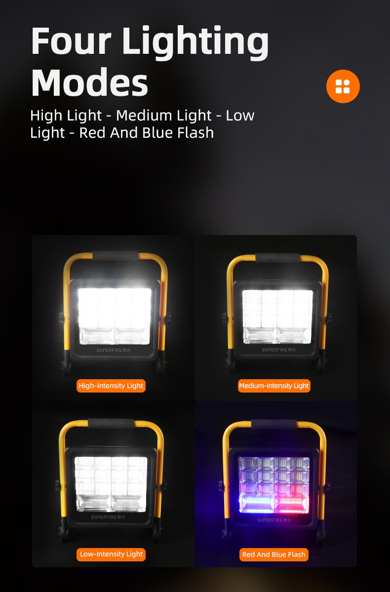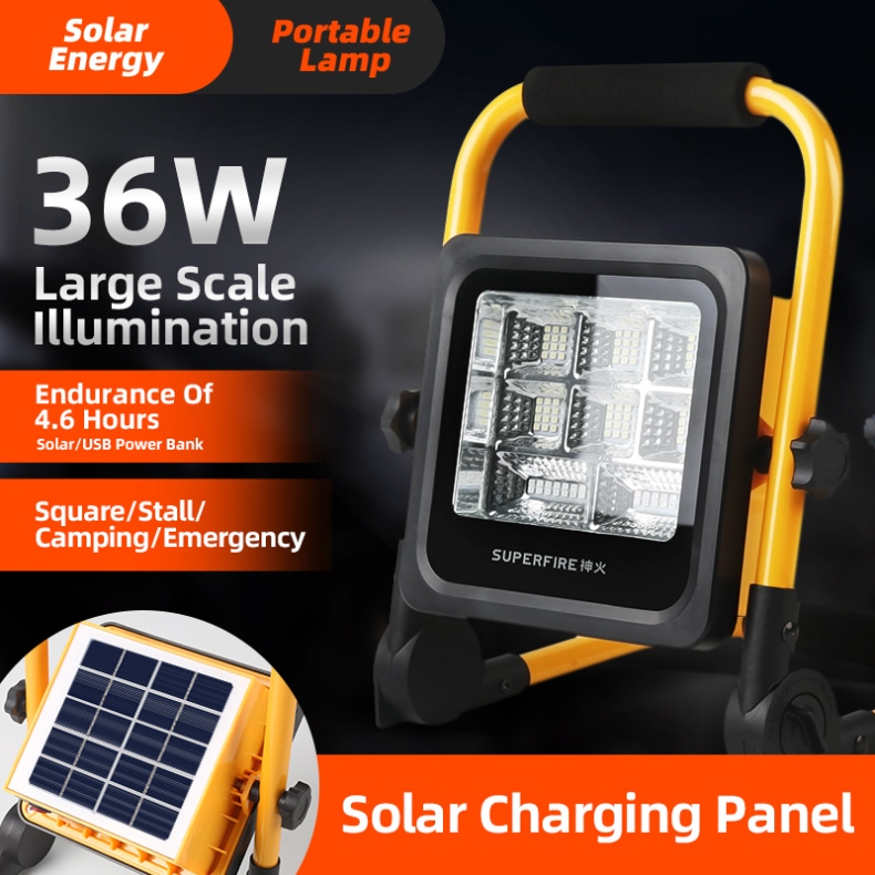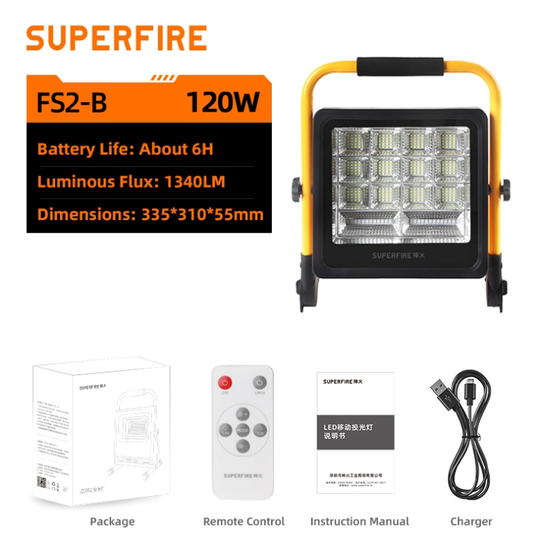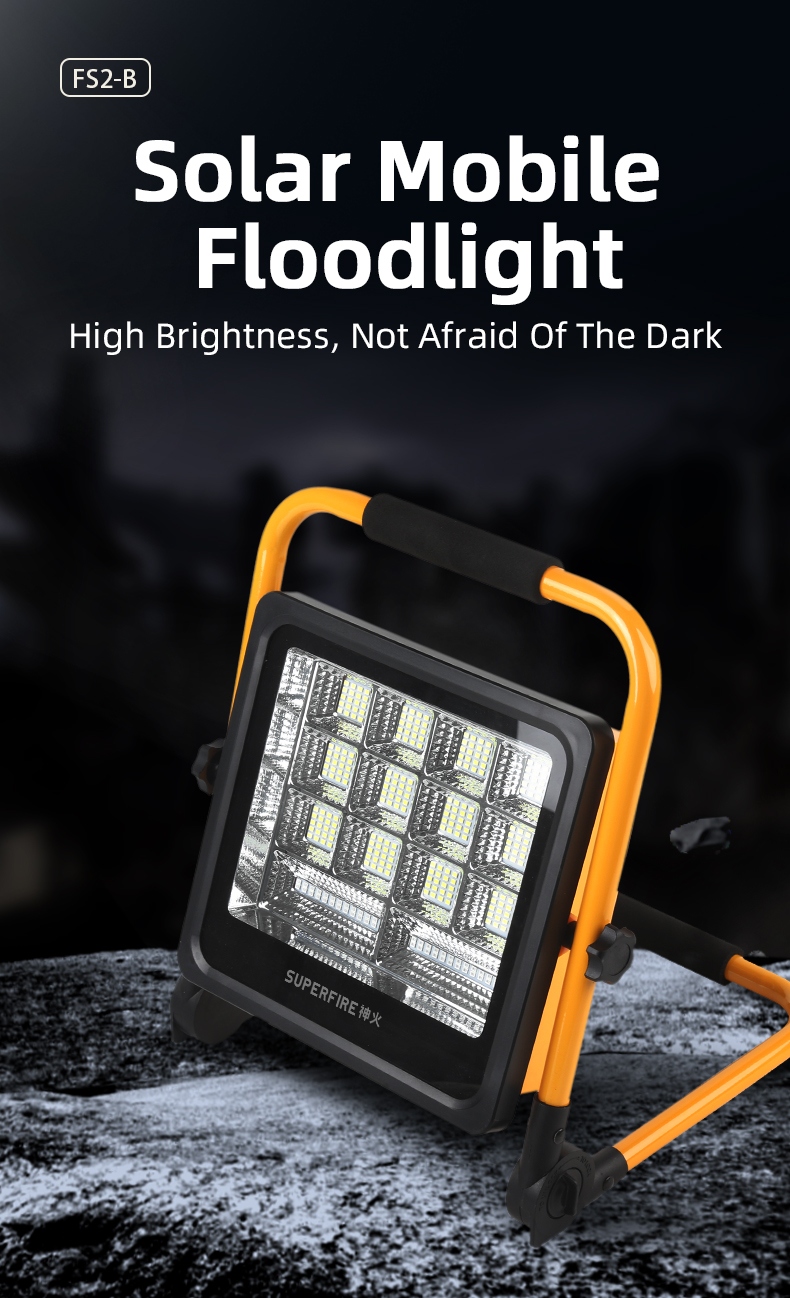 The SUPERFIRE FS2-A/B series portable LED floodlights are versatile, high-performance lighting solutions designed for various outdoor applications. Available in 36W (FS2-A) and 120W (FS2-B) models, these floodlights offer exceptional illumination, durability, and convenience. With features like solar charging, multiple lighting modes, and robust construction, the FS2 series is perfect for camping, construction sites, emergency situations, and more.