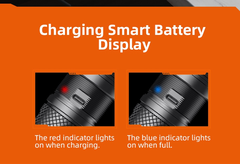 · Charging indicators: Red = charging; Blue = fully charged; Flashing light = charging interruption alert.
