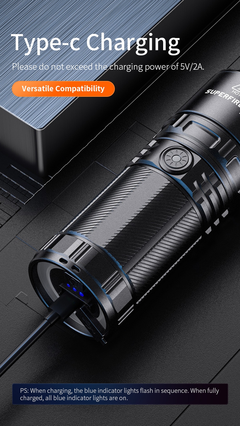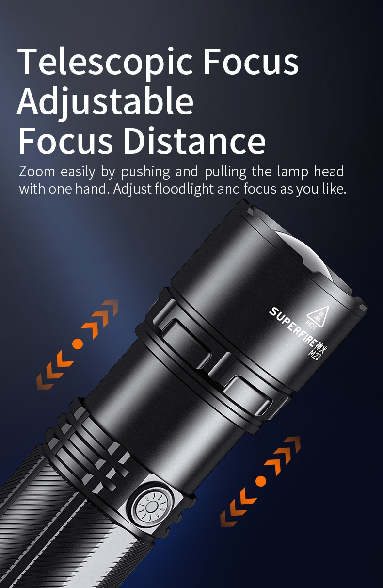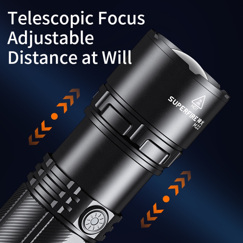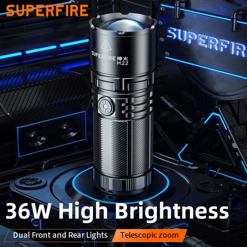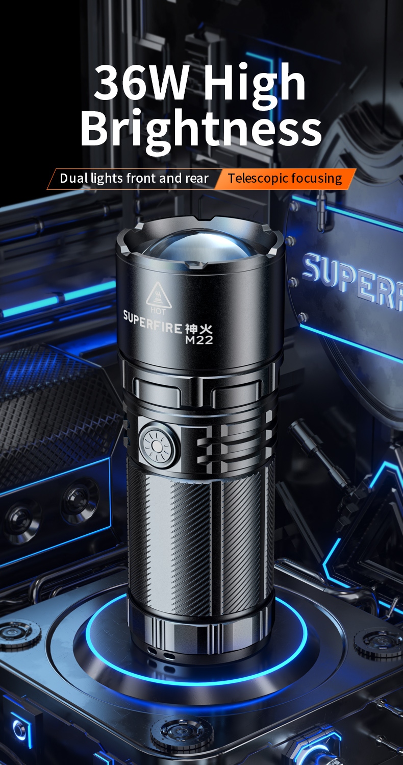 The SUPERFIRE M22 is a high-performance rechargeable LED flashlight designed for various outdoor activities and emergency situations. With its powerful 2150-lumen output, 400-meter beam distance, and adjustable focus, the M22 offers exceptional illumination in a durable package. Featuring multiple lighting modes, including front and tail lights, this flashlight is perfect for camping, hiking, search and rescue, and other demanding applications.