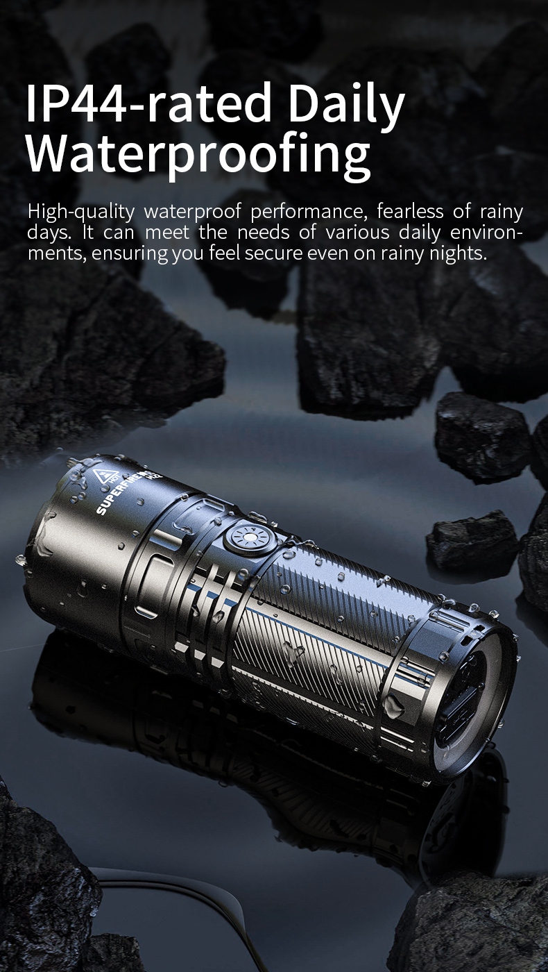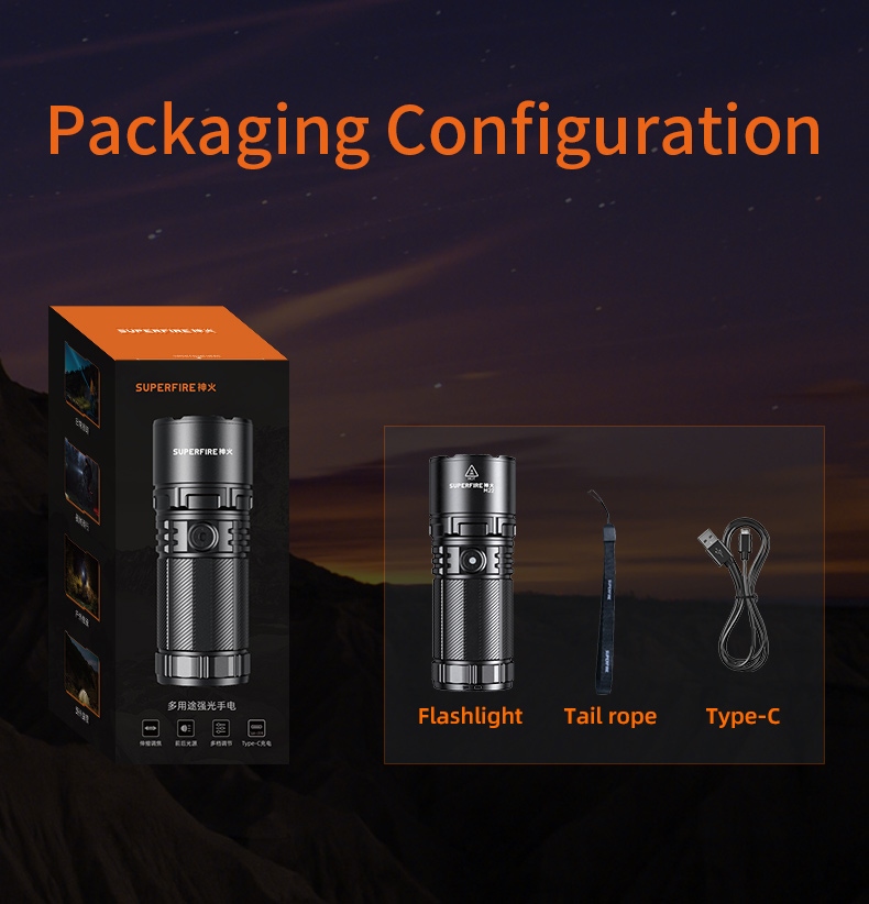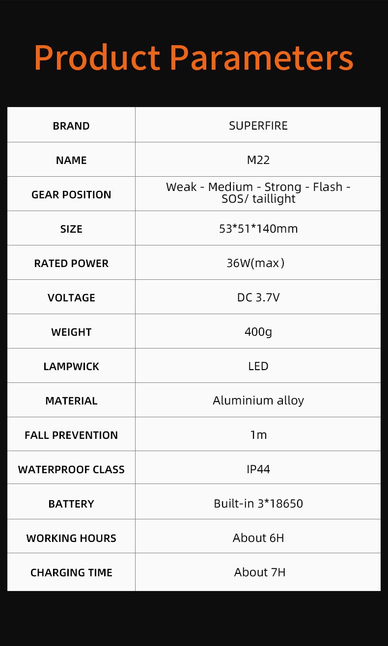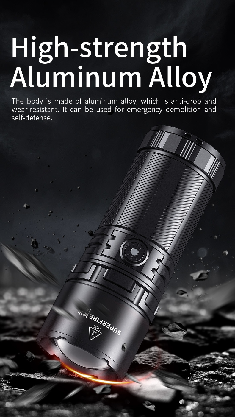 The SUPERFIRE M22 is a high-performance rechargeable LED flashlight designed for various outdoor activities and emergency situations. With its powerful 2150-lumen output, 400-meter beam distance, and adjustable focus, the M22 offers exceptional illumination in a durable package. Featuring multiple lighting modes, including front and tail lights, this flashlight is perfect for camping, hiking, search and rescue, and other demanding applications.