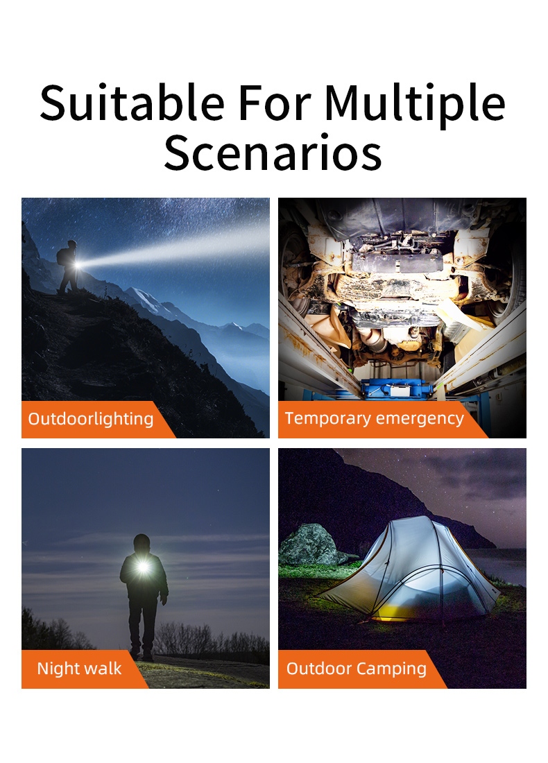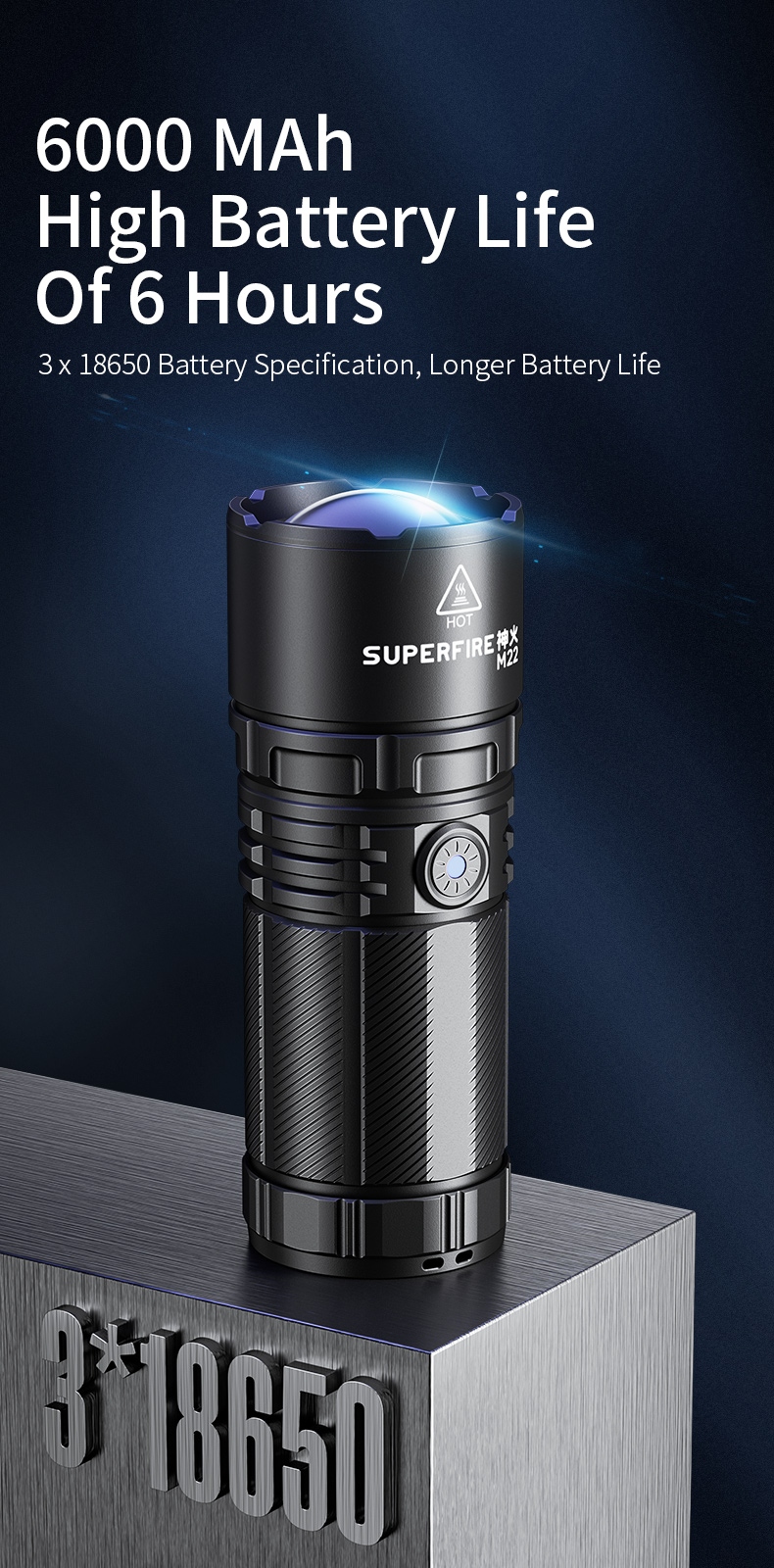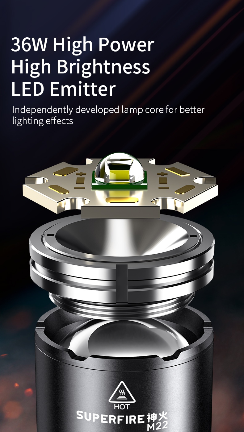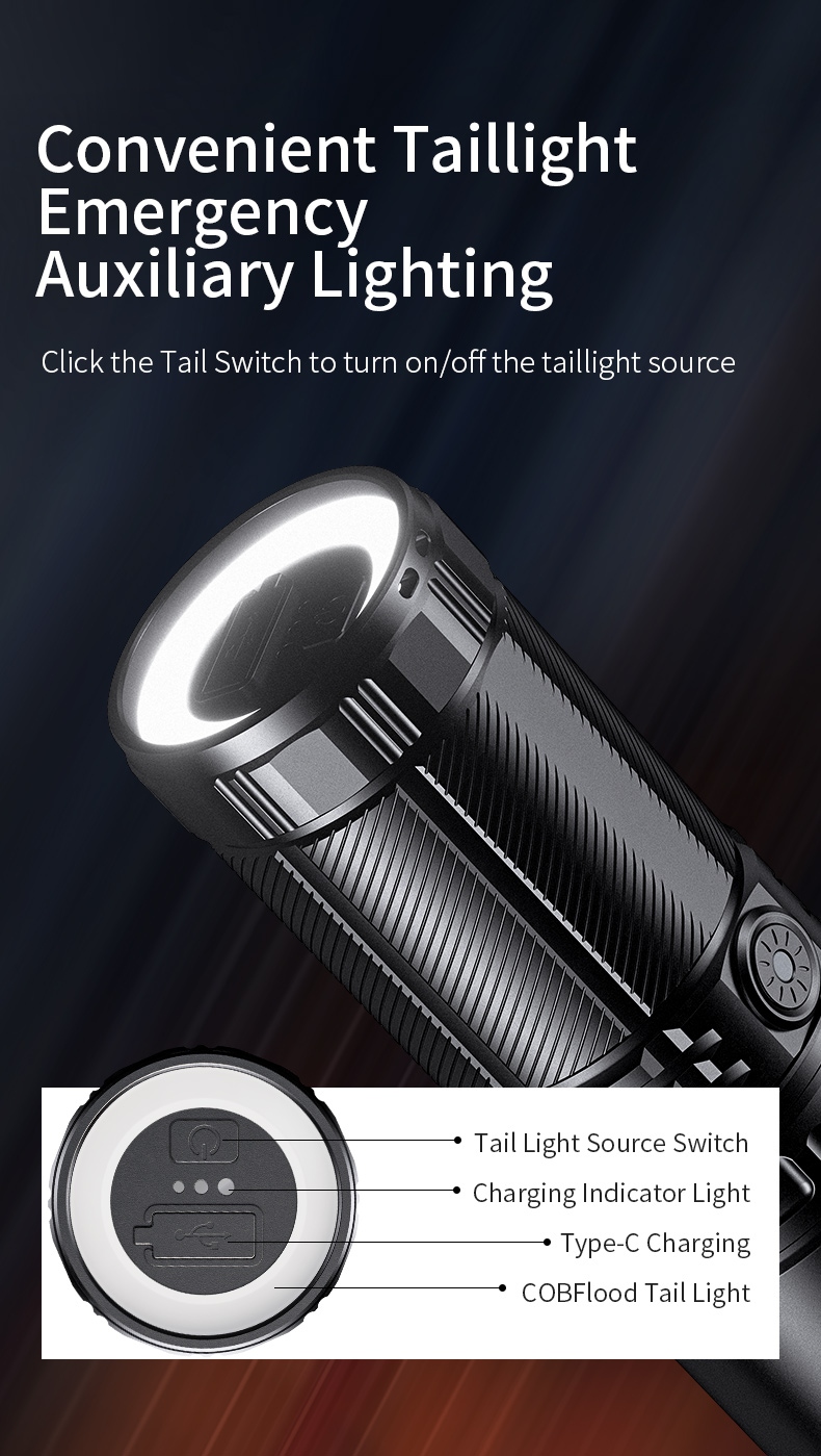 The SUPERFIRE M22 is a high-performance rechargeable LED flashlight designed for various outdoor activities and emergency situations. With its powerful 2150-lumen output, 400-meter beam distance, and adjustable focus, the M22 offers exceptional illumination in a durable package. Featuring multiple lighting modes, including front and tail lights, this flashlight is perfect for camping, hiking, search and rescue, and other demanding applications.