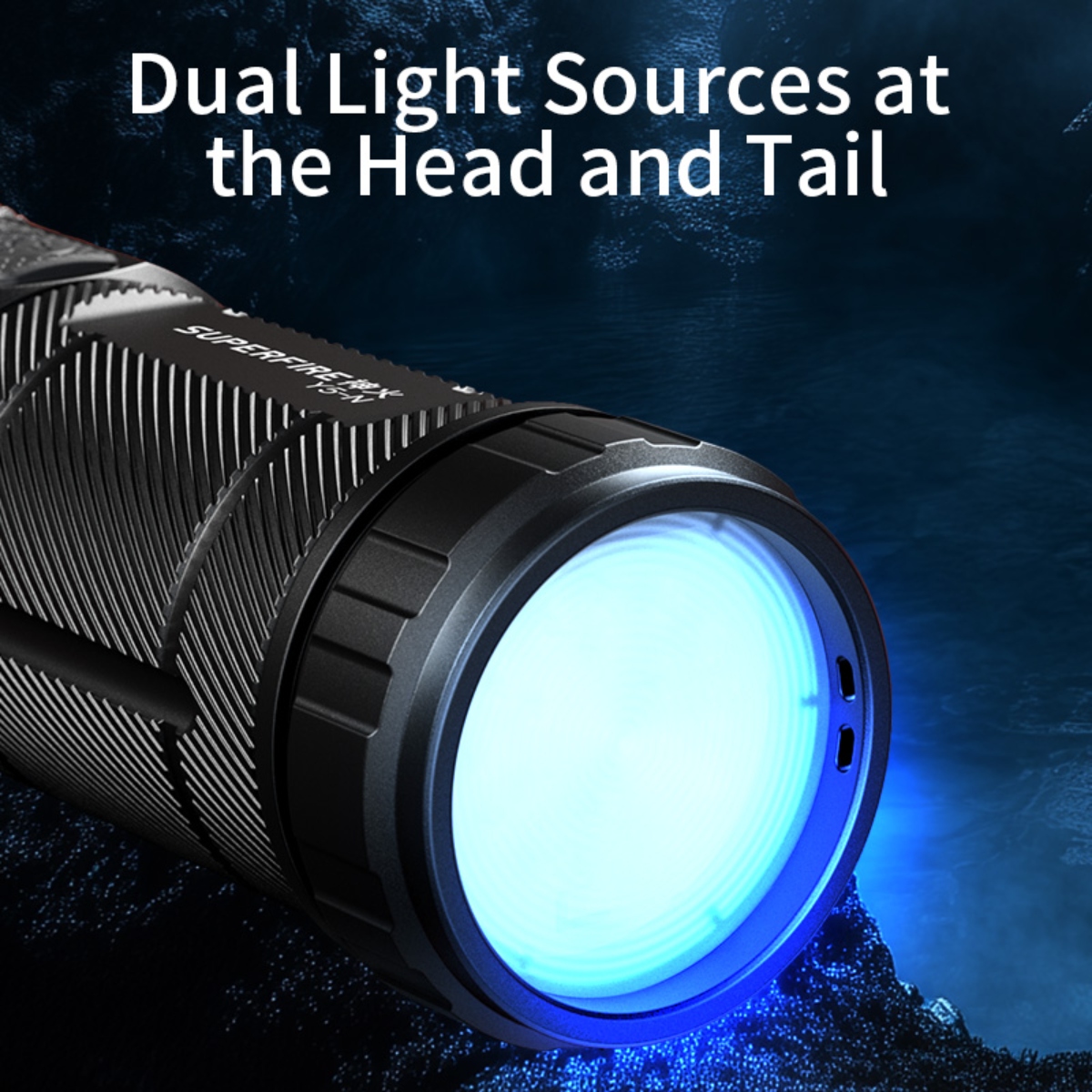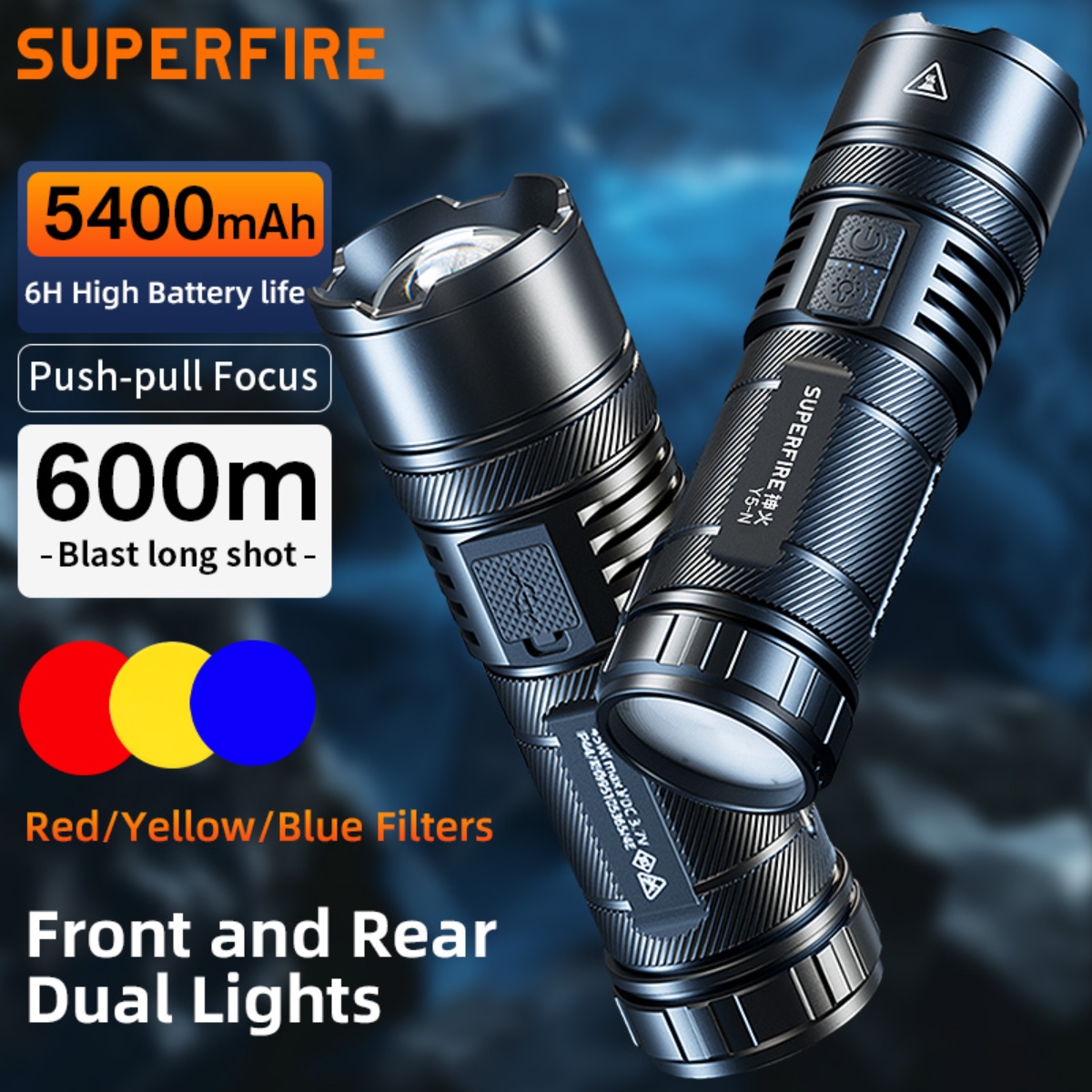 The SUPERFIRE Y5-N is a high-performance, dual-light flashlight designed for outdoor enthusiasts and professionals who demand powerful illumination and versatility. With its impressive 720 lumens output, 600-meter beam distance, and adjustable focus, the Y5-N is your reliable companion for various lighting needs, from long-range illumination to close-up tasks.