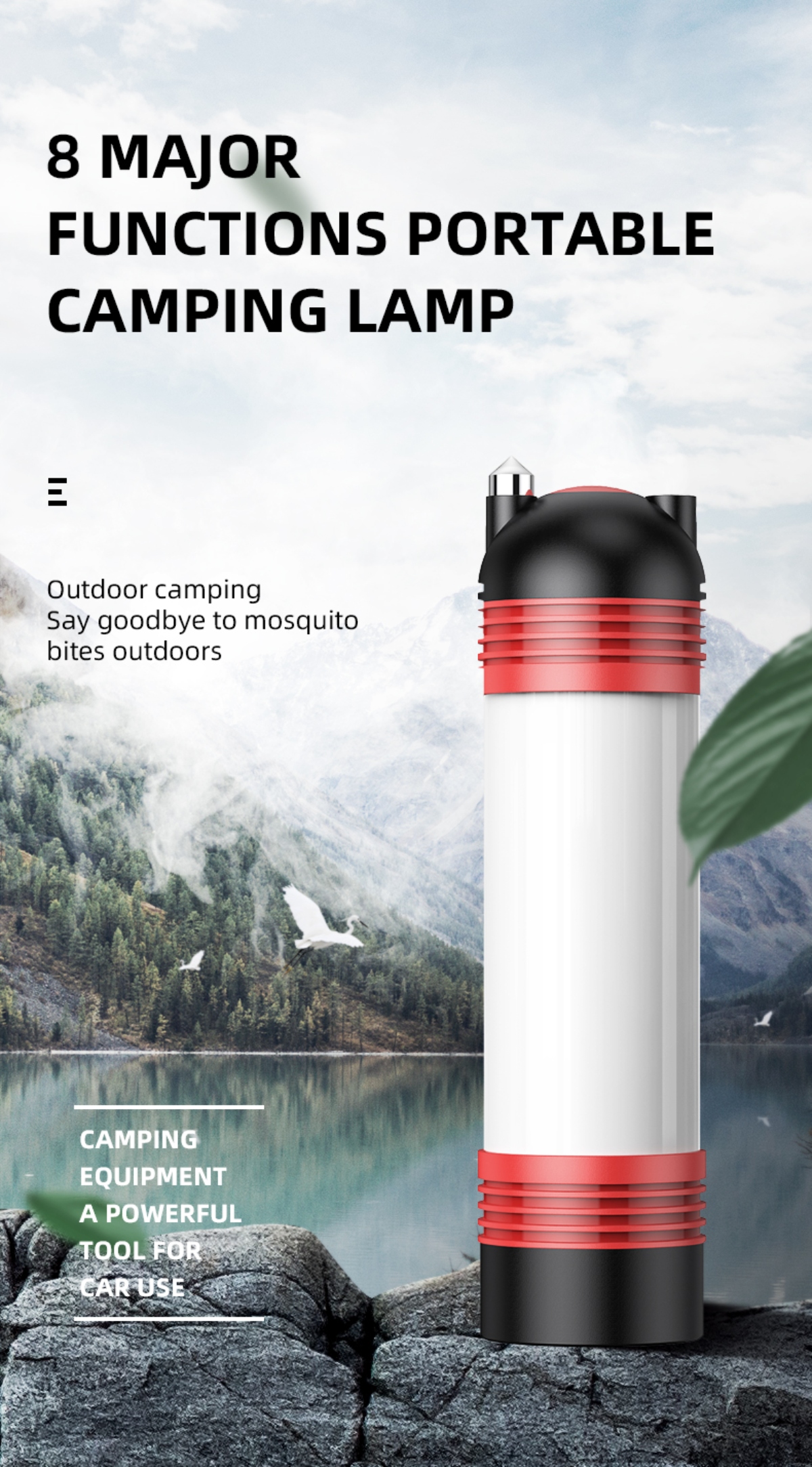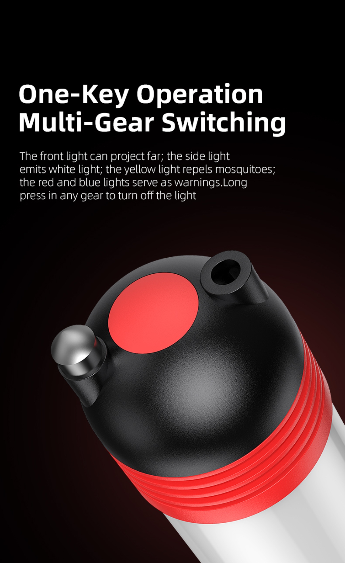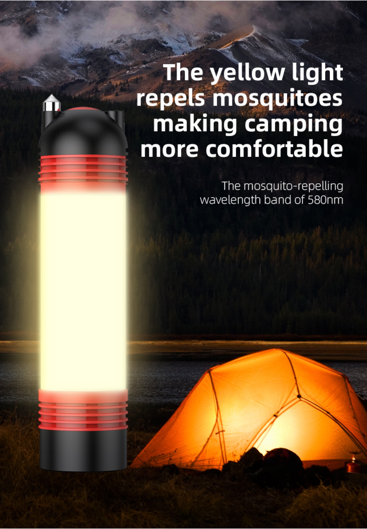 Multiple lighting modes: White light (Strong, Medium, Weak), Yellow light (Mosquito repellent), Red-Blue flash