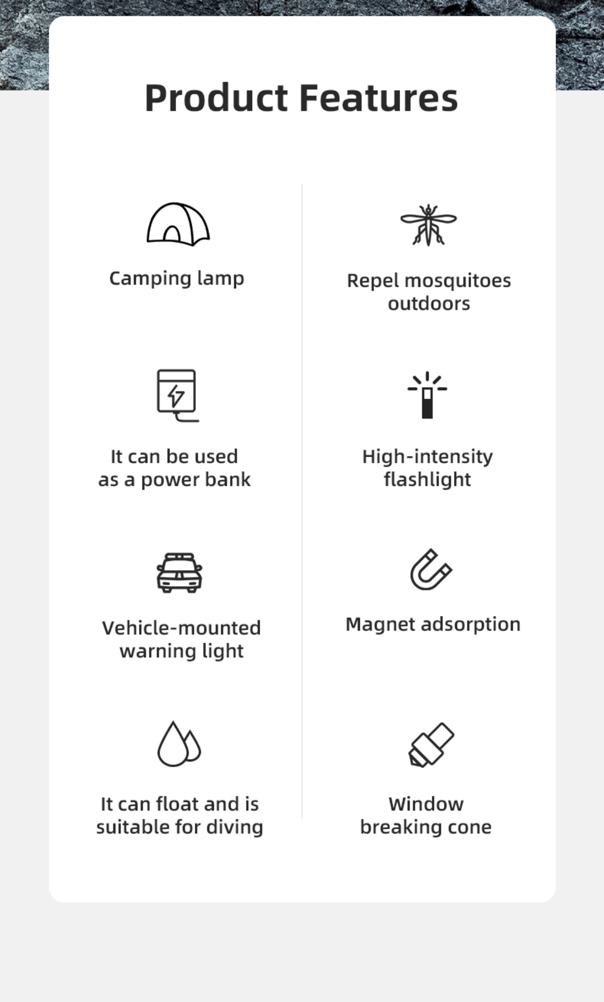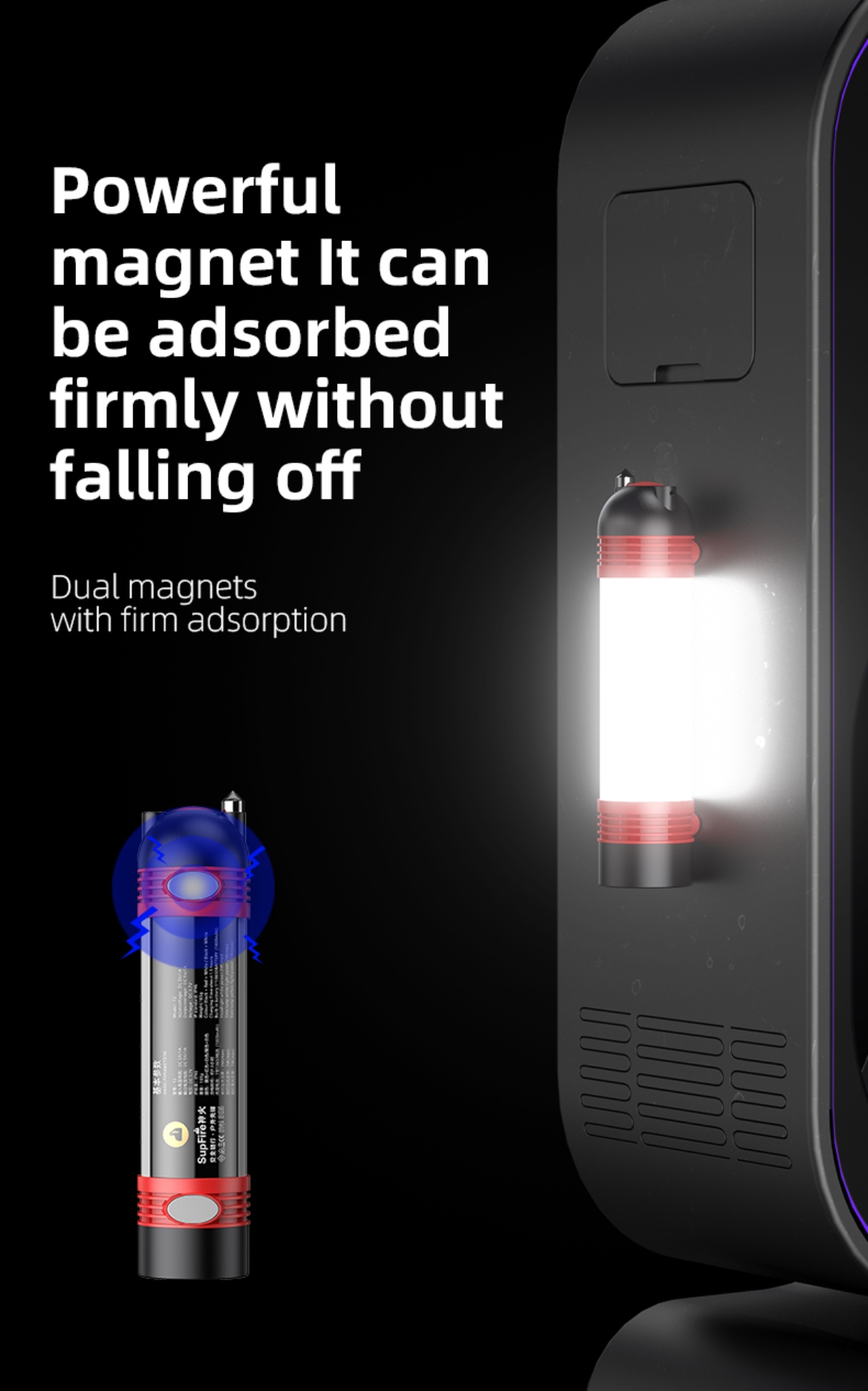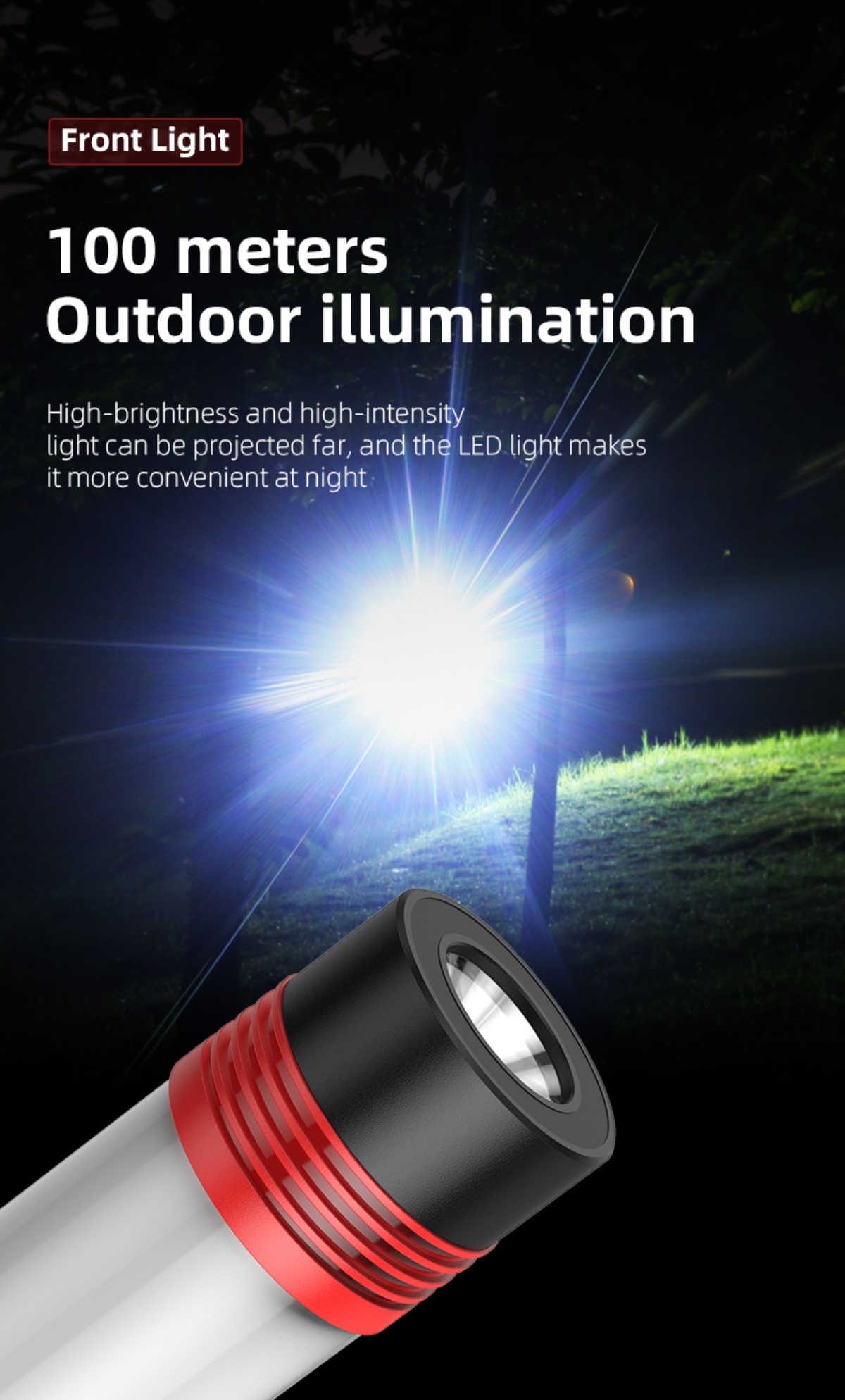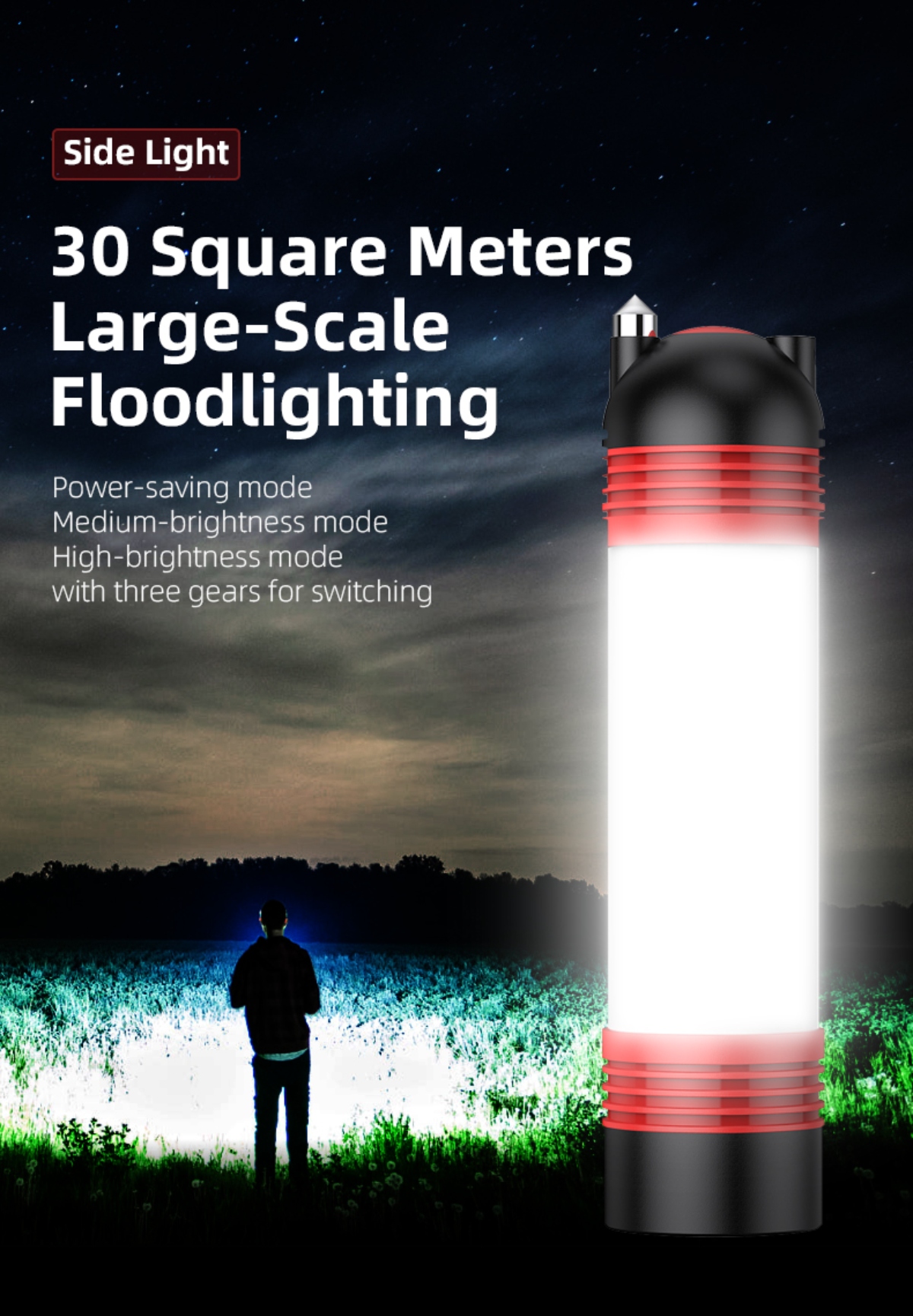 Multiple lighting modes: White light (Strong, Medium, Weak), Yellow light (Mosquito repellent), Red-Blue flash