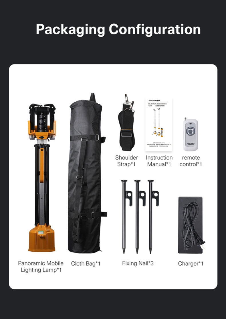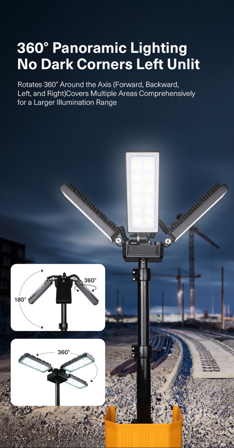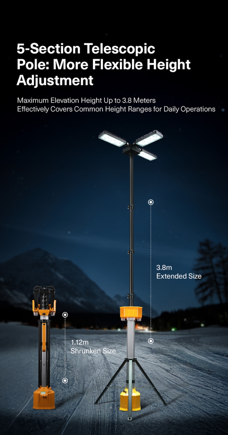 Telescopic Mast (5 Sections): The pole can be extended and retracted in five sections, allowing the light to reach a maximum height of 3.8 meters (about 12.5 feet), offering excellent flexibility in height adjustment.