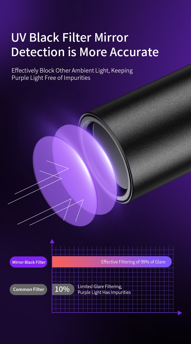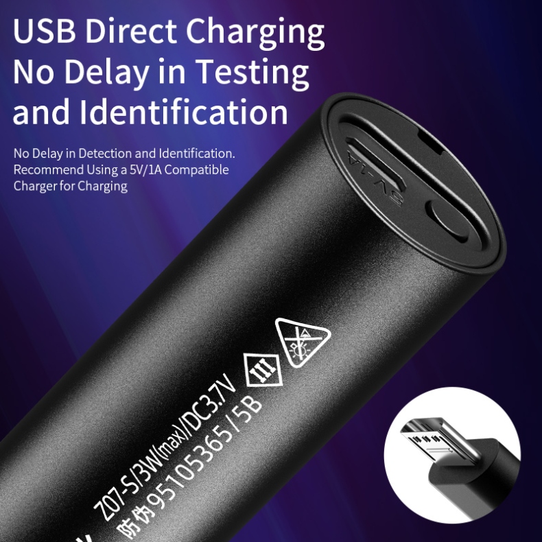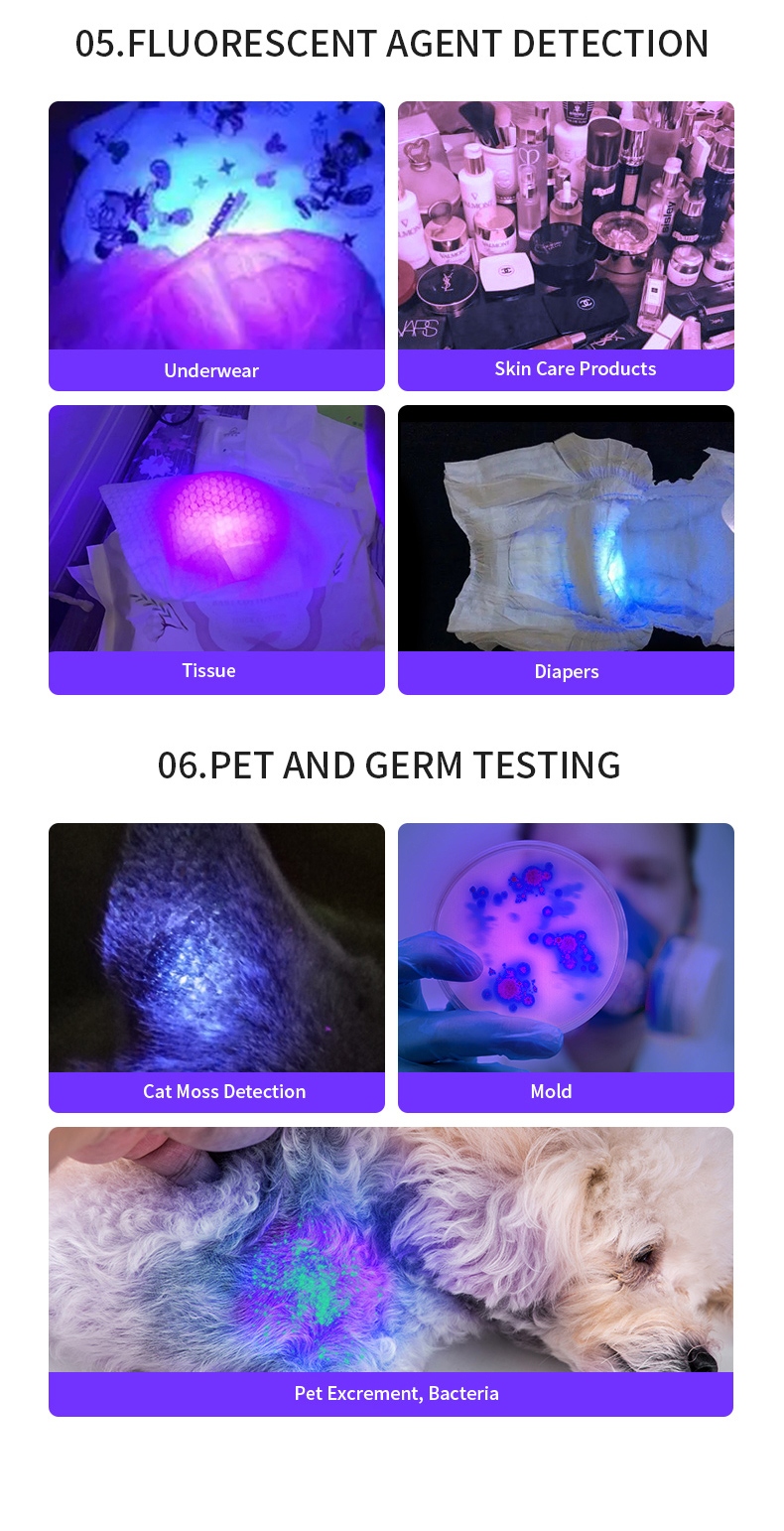 1.Ultraviolet flashlight: can be used for banknote inspection, fluorescent agent identification, pet fluorescence detection, amber and beeswax identification, antique repair and identification. 2. Diversified charging for easy use: Equipped with a Micro - USB charging interface, it can be charged by chargers, power banks, computers and other devices. 3. With a constant - current driver, it is brighter and has a longer service life. 4. Small and exquisite, it is more convenient to carry when going out. 5. Pure purple light: The 365nm purple light is multi - functional and can detect fluorescence, germs and be used for anti - counterfeiting.
