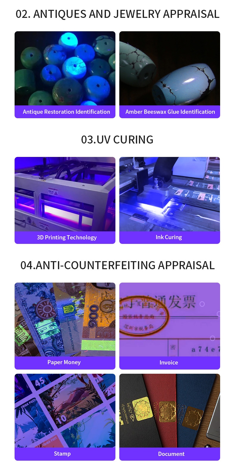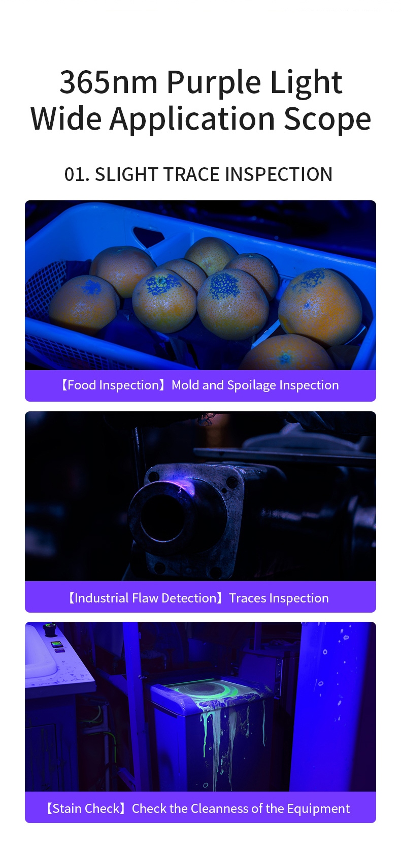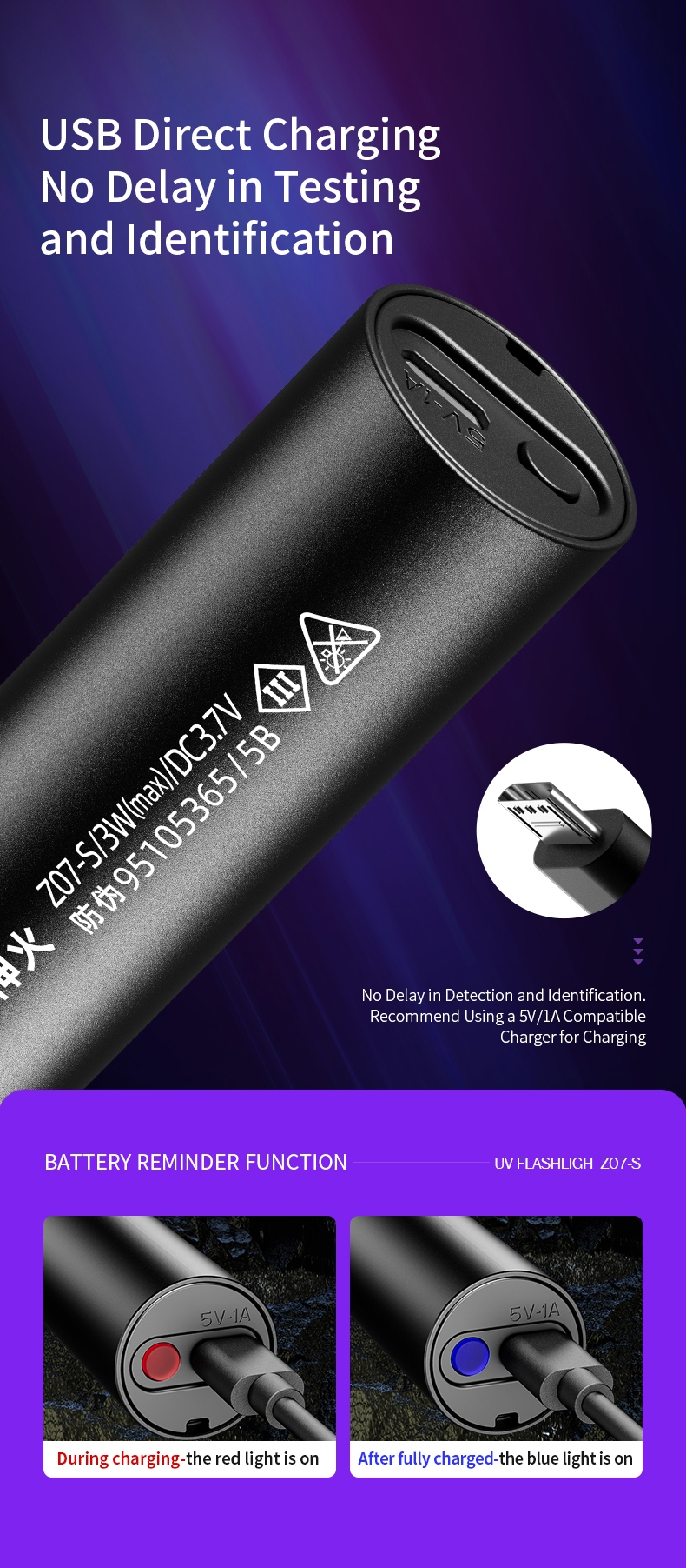 1.Ultraviolet flashlight: can be used for banknote inspection, fluorescent agent identification, pet fluorescence detection, amber and beeswax identification, antique repair and identification. 2. Diversified charging for easy use: Equipped with a Micro - USB charging interface, it can be charged by chargers, power banks, computers and other devices. 3. With a constant - current driver, it is brighter and has a longer service life. 4. Small and exquisite, it is more convenient to carry when going out. 5. Pure purple light: The 365nm purple light is multi - functional and can detect fluorescence, germs and be used for anti - counterfeiting.