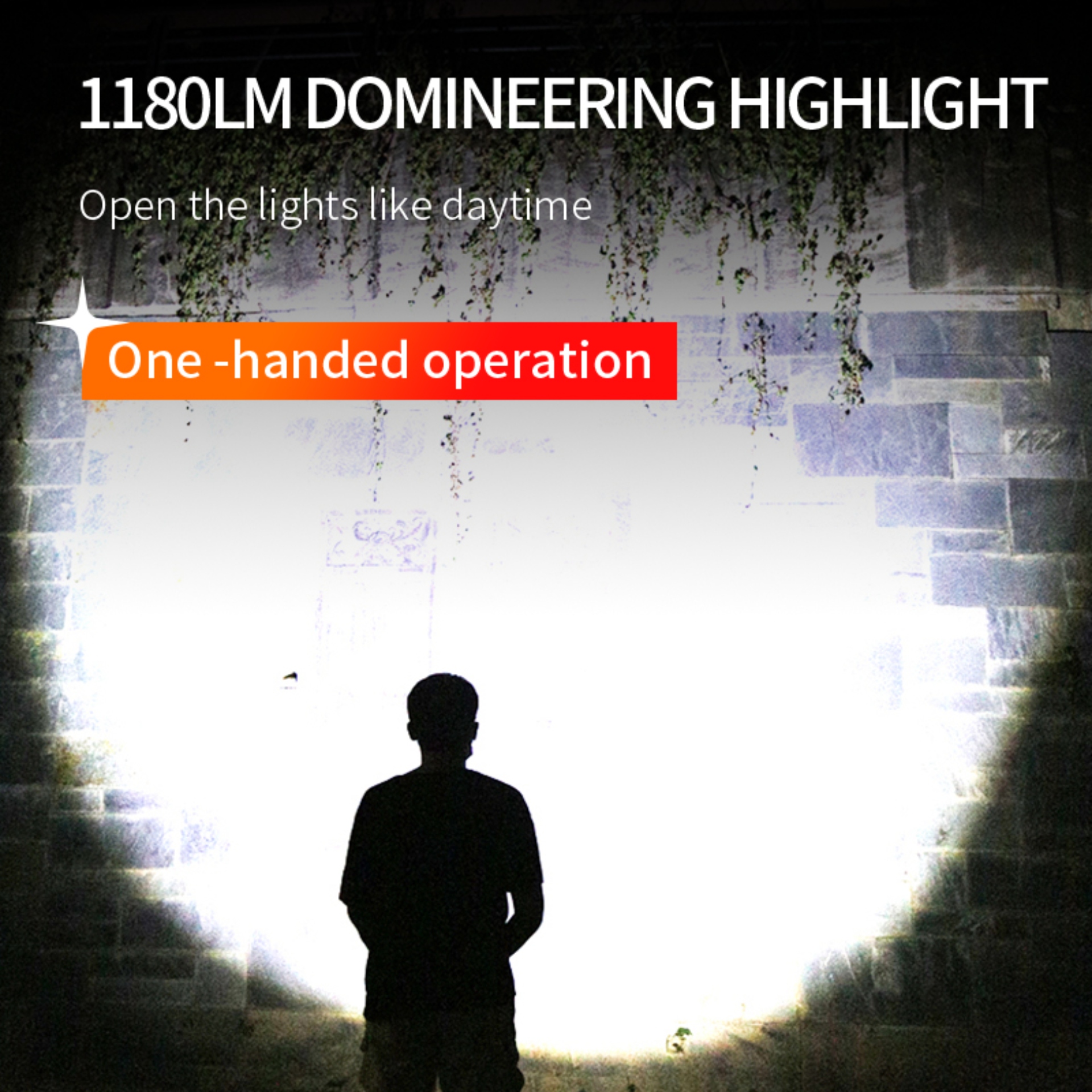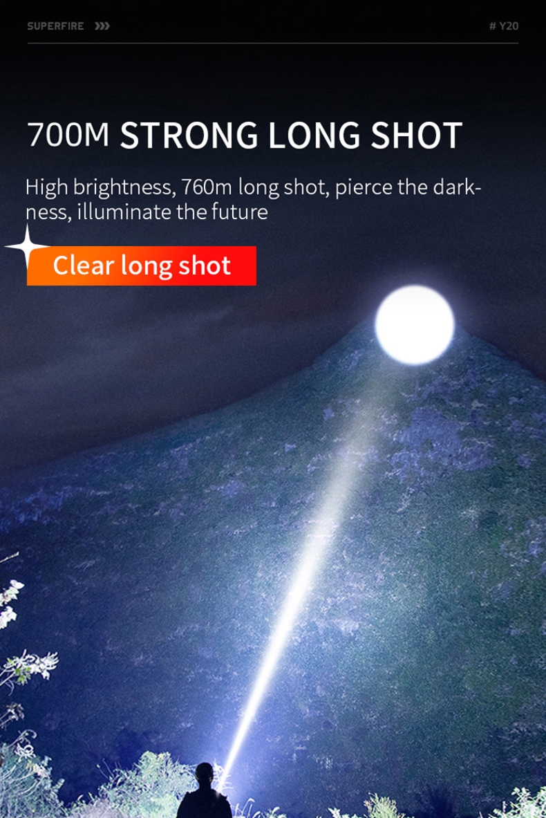 This flashlight can reach 1200LM.Open the lights like daytime.High brightness,700m long shot.Pierce the darkness,illuminate the future.Pan -light condensing with the heart, the emancipation of both hands is more comfortable, and the travel lighting is not tired.Click the middle switch to turn on the weak light and continue to adjust the file (weak light-mid-light-strong light).Click the Emergency button to turn on the sos, and prescirculating gear (SoS-Flash).Multi -segment waterproof design can meet the use of various living environment, rain and snow weather is also online.