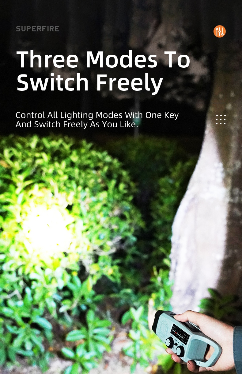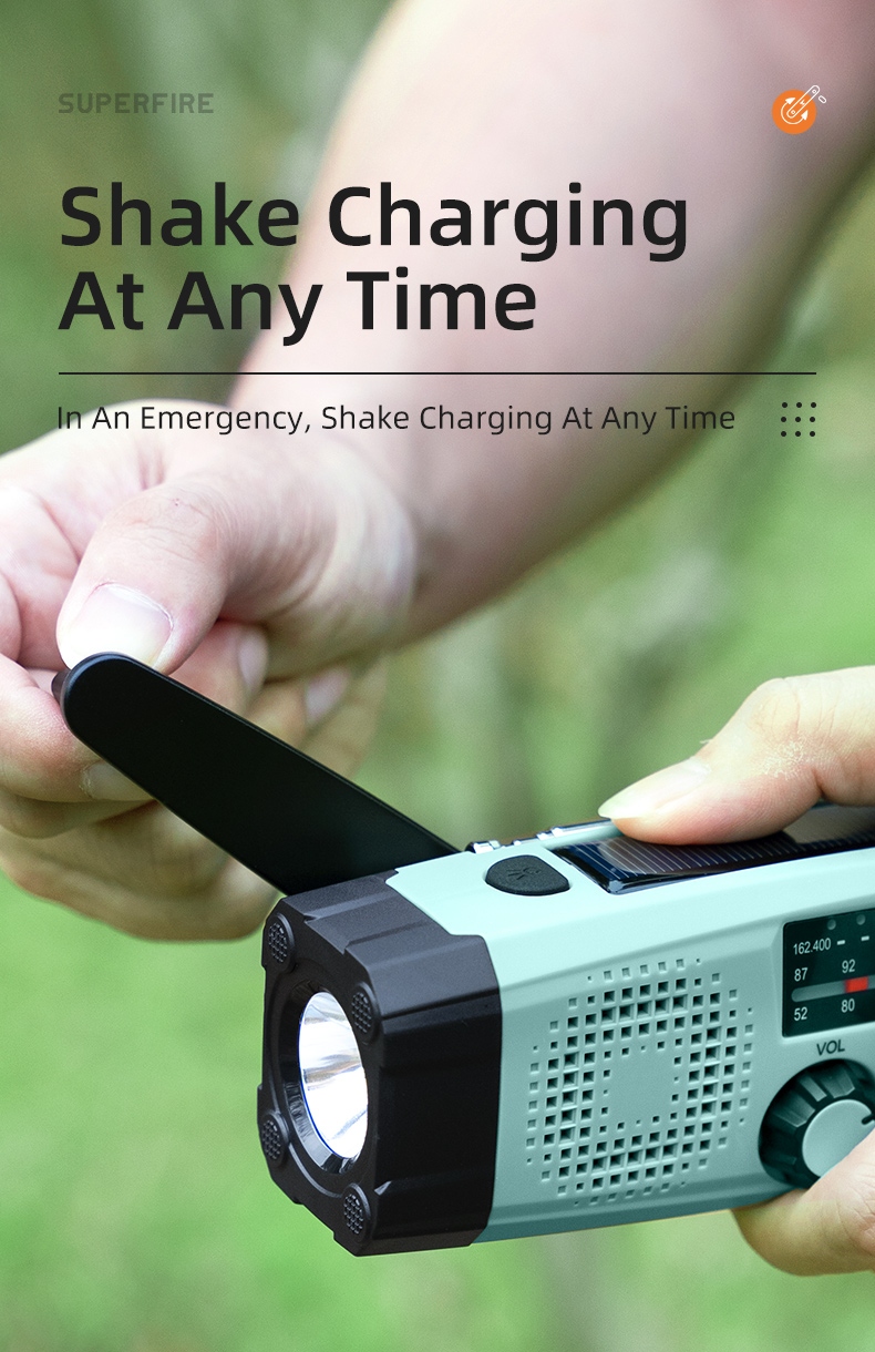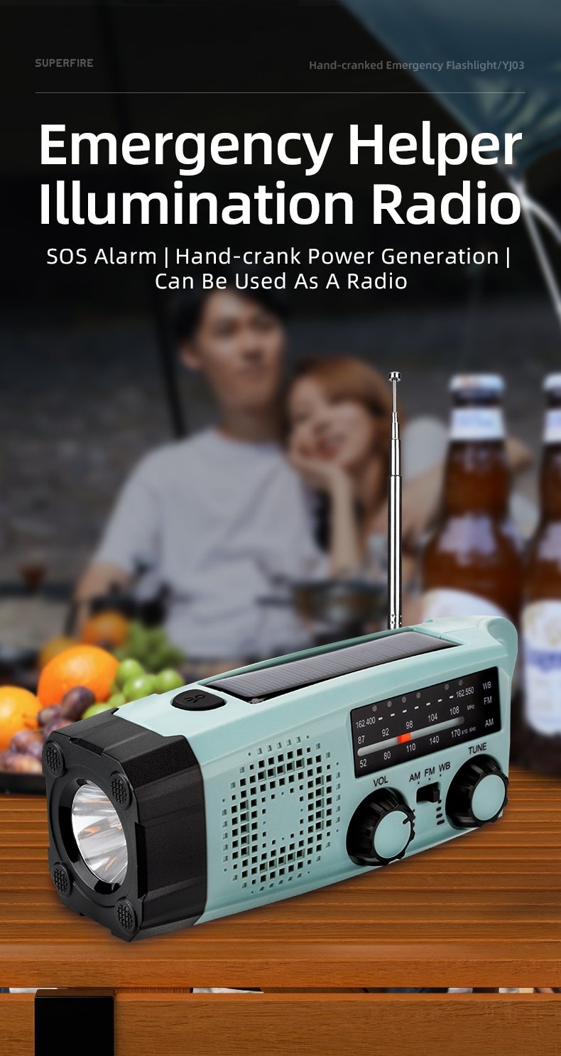 The SUPERFIRE YJ03 Multi-Functional Emergency Flashlight is a versatile and reliable lighting solution designed for emergencies, outdoor activities, and everyday use. With its multiple charging options, including hand crank, solar power, and USB, this compact device ensures you're never left in the dark. Featuring a flashlight, built-in FM/AM/WB radio, power bank function, and SOS alarm, the YJ03 is an essential tool for emergency preparedness and outdoor adventures.