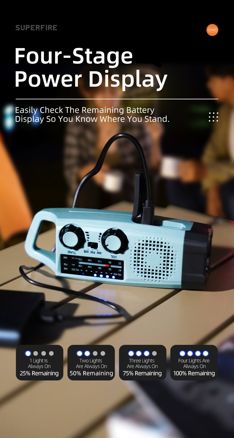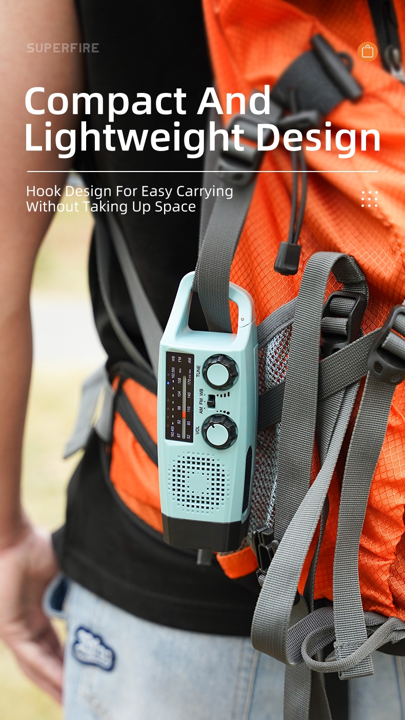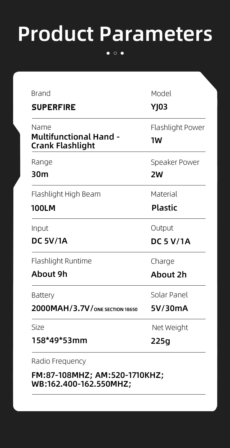 The SUPERFIRE YJ03 Multi-Functional Emergency Flashlight is a versatile and reliable lighting solution designed for emergencies, outdoor activities, and everyday use. With its multiple charging options, including hand crank, solar power, and USB, this compact device ensures you're never left in the dark. Featuring a flashlight, built-in FM/AM/WB radio, power bank function, and SOS alarm, the YJ03 is an essential tool for emergency preparedness and outdoor adventures.