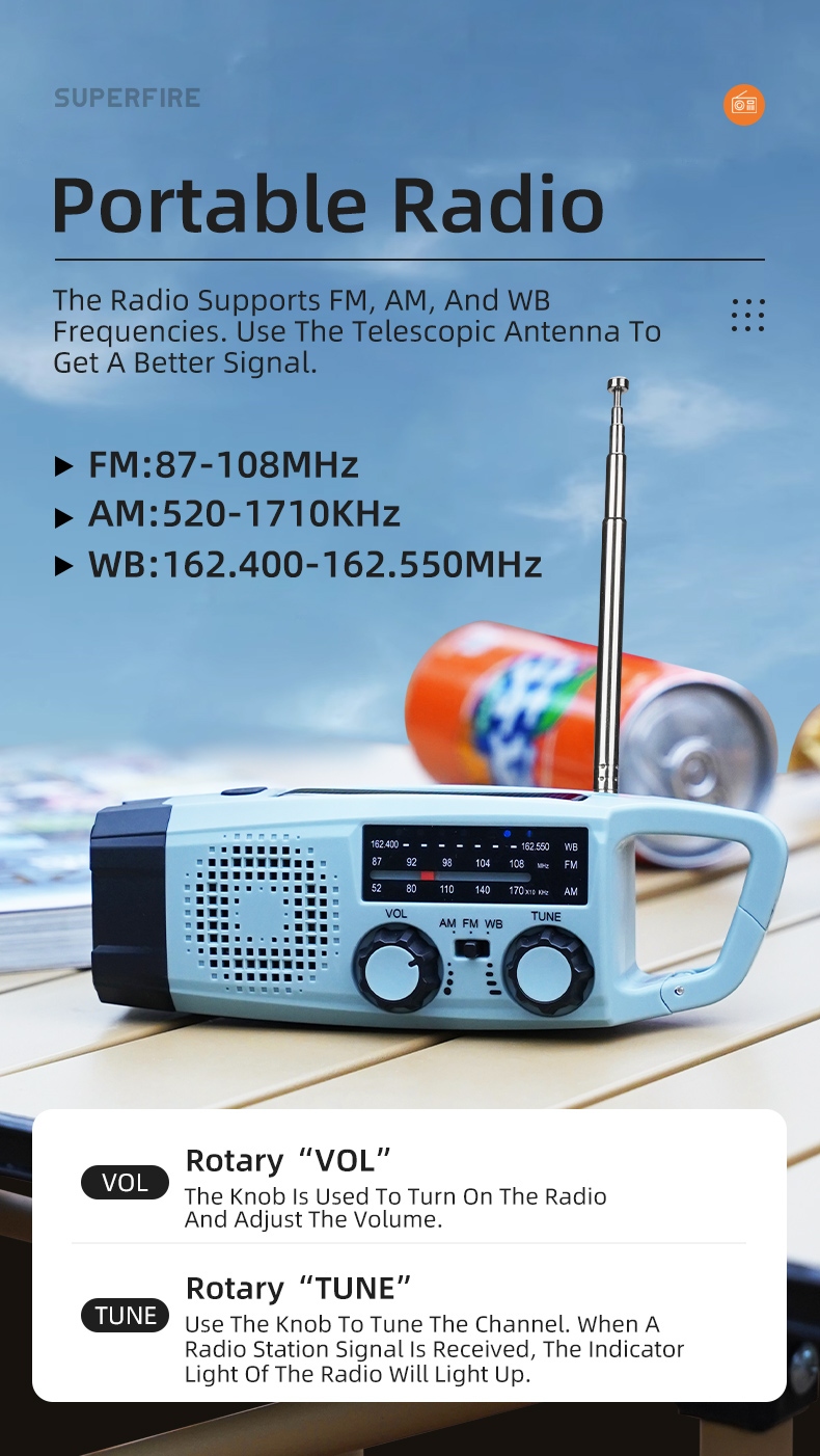 Radio Frequency:FM: 87-108MHz, AM: 520-1710KHz, WB: 162.400-162.550MHz