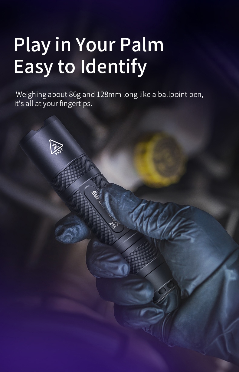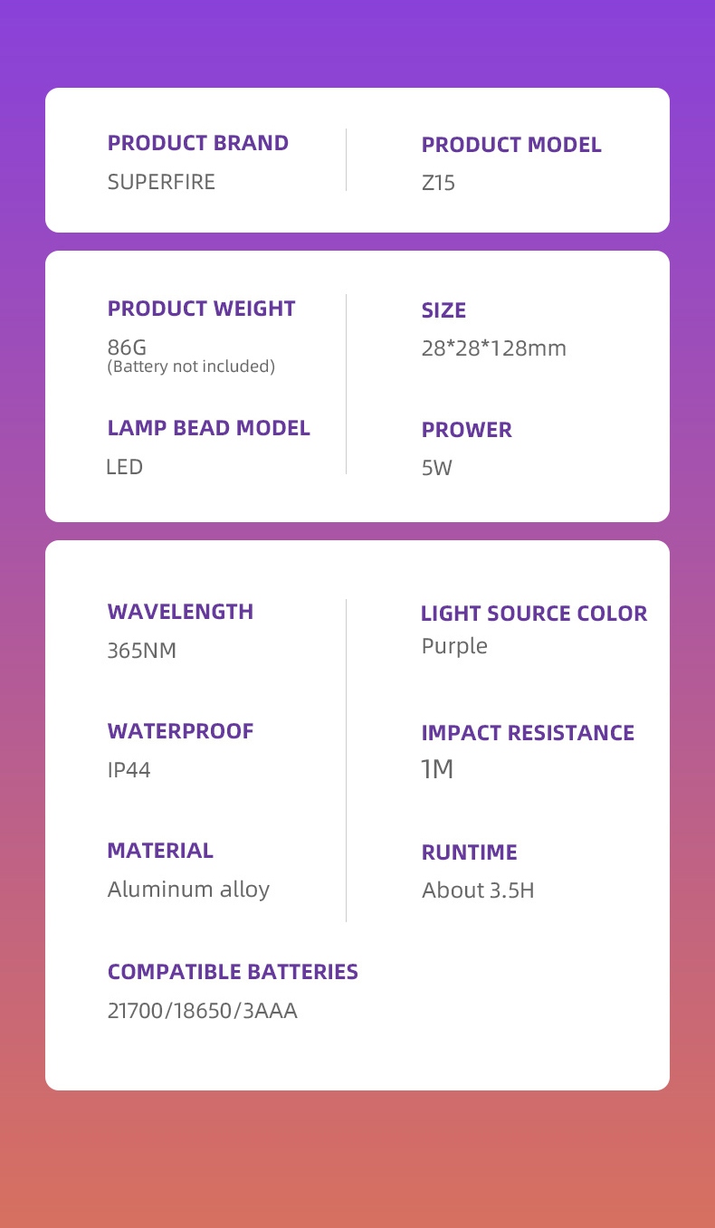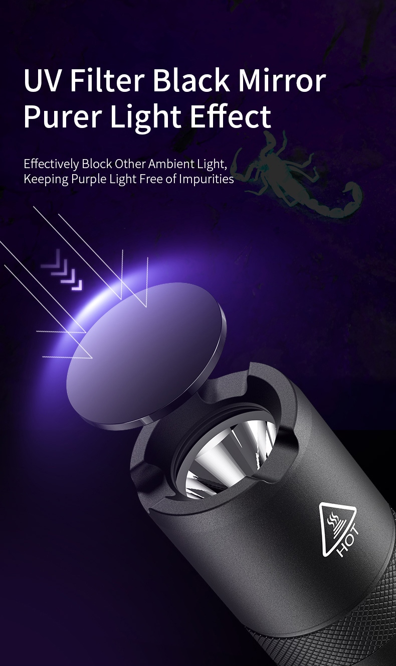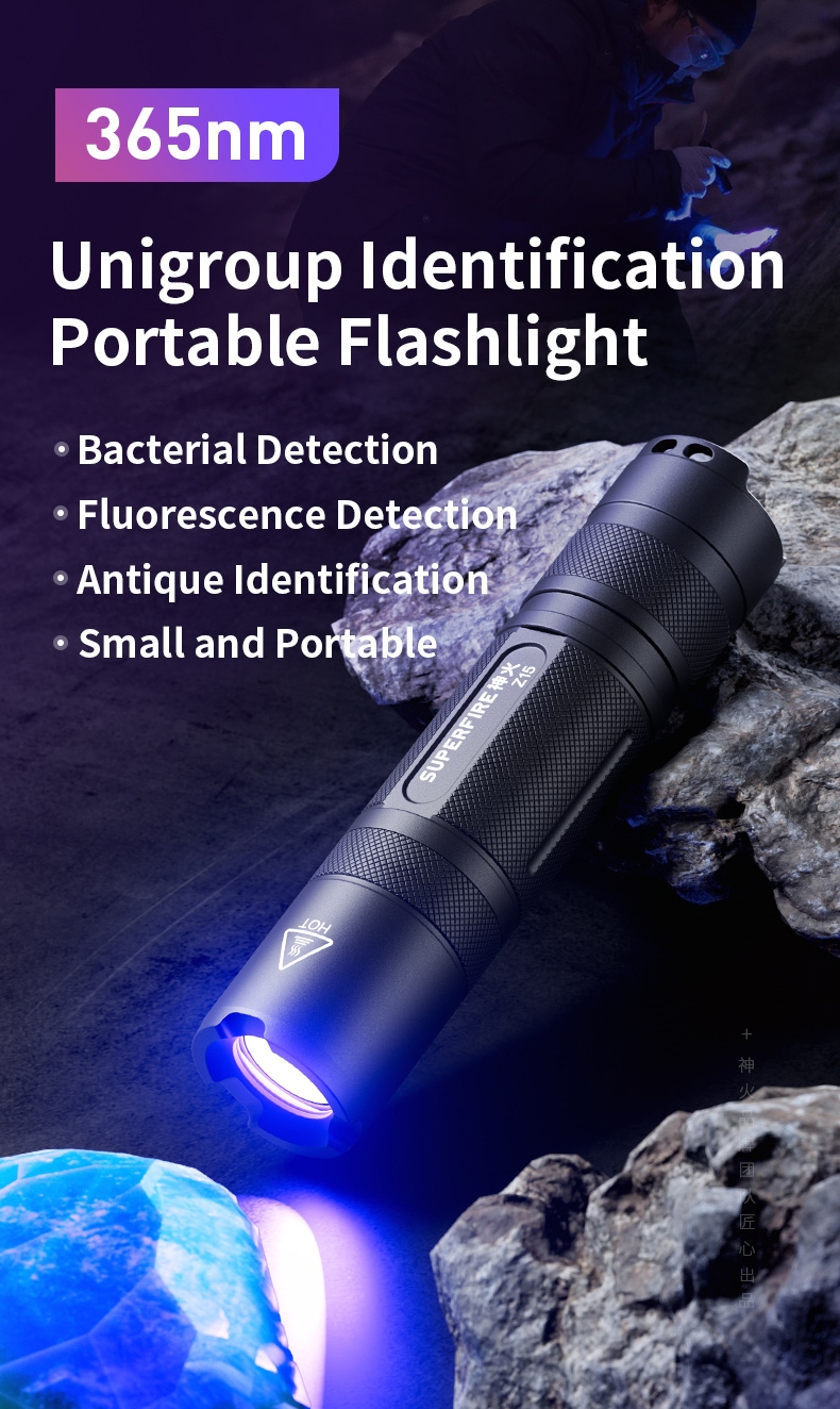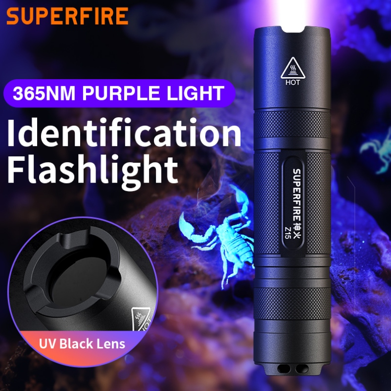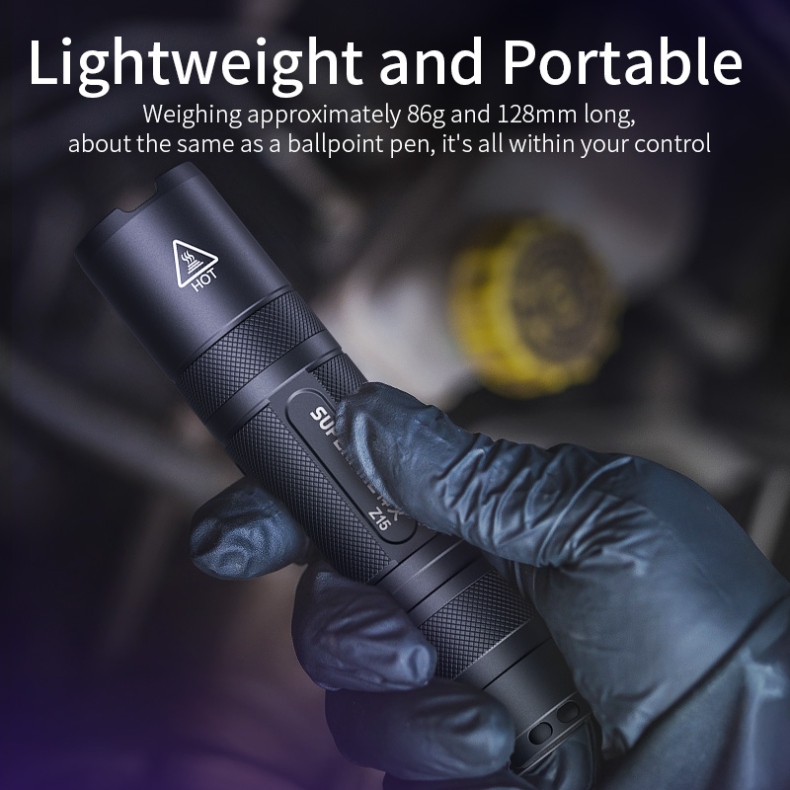 The Z15 UV Flashlight is a powerful and compact ultraviolet light source designed for both professional and hobbyist applications. With its precise 365nm wavelength and impressive 40-meter beam range, this aluminum alloy flashlight provides reliable UV illumination for various tasks. Featuring a robust construction, IP44 water resistance, and a long 3.5-hour runtime, the Z15 is the perfect tool for detecting fluorescent materials, authenticating documents, or exploring the hidden world of UV-reactive substances.